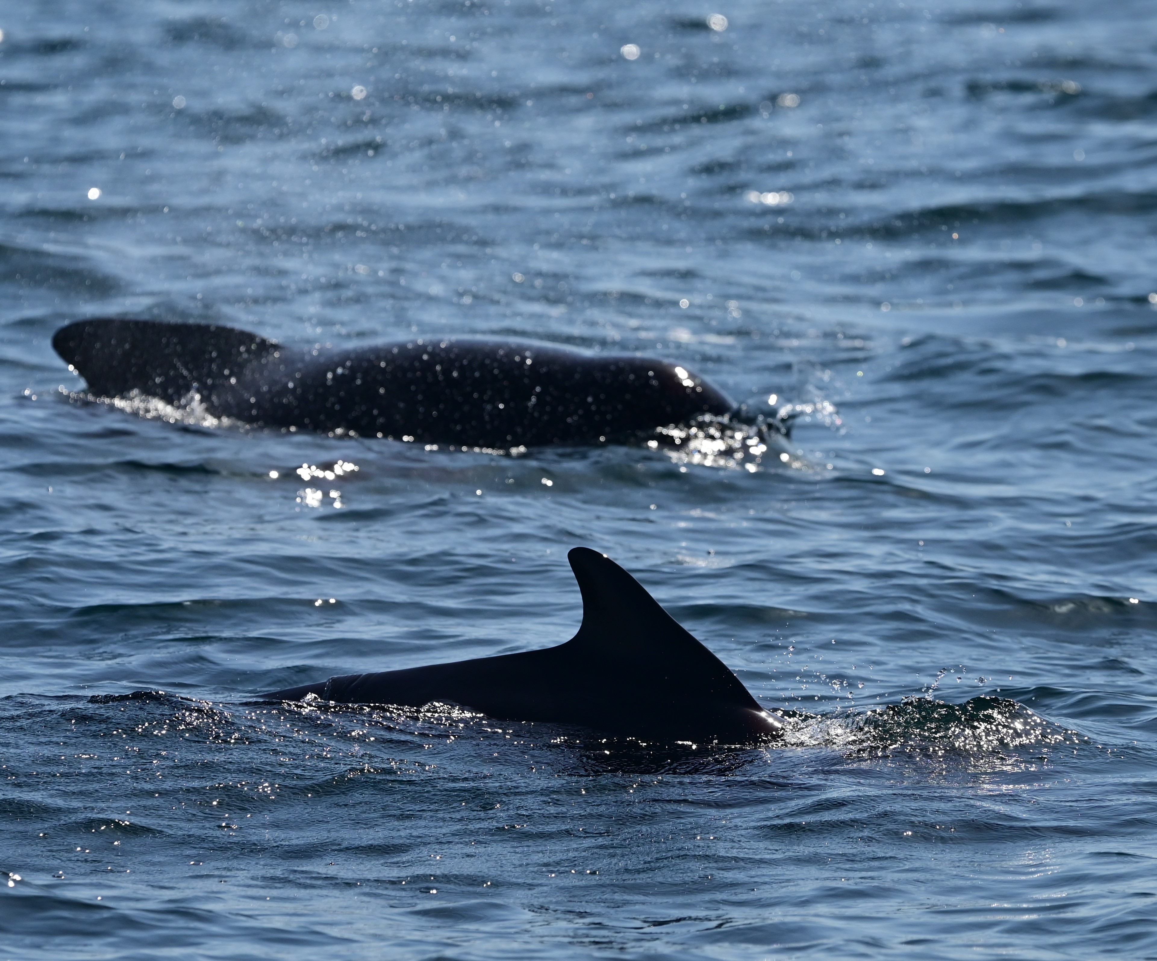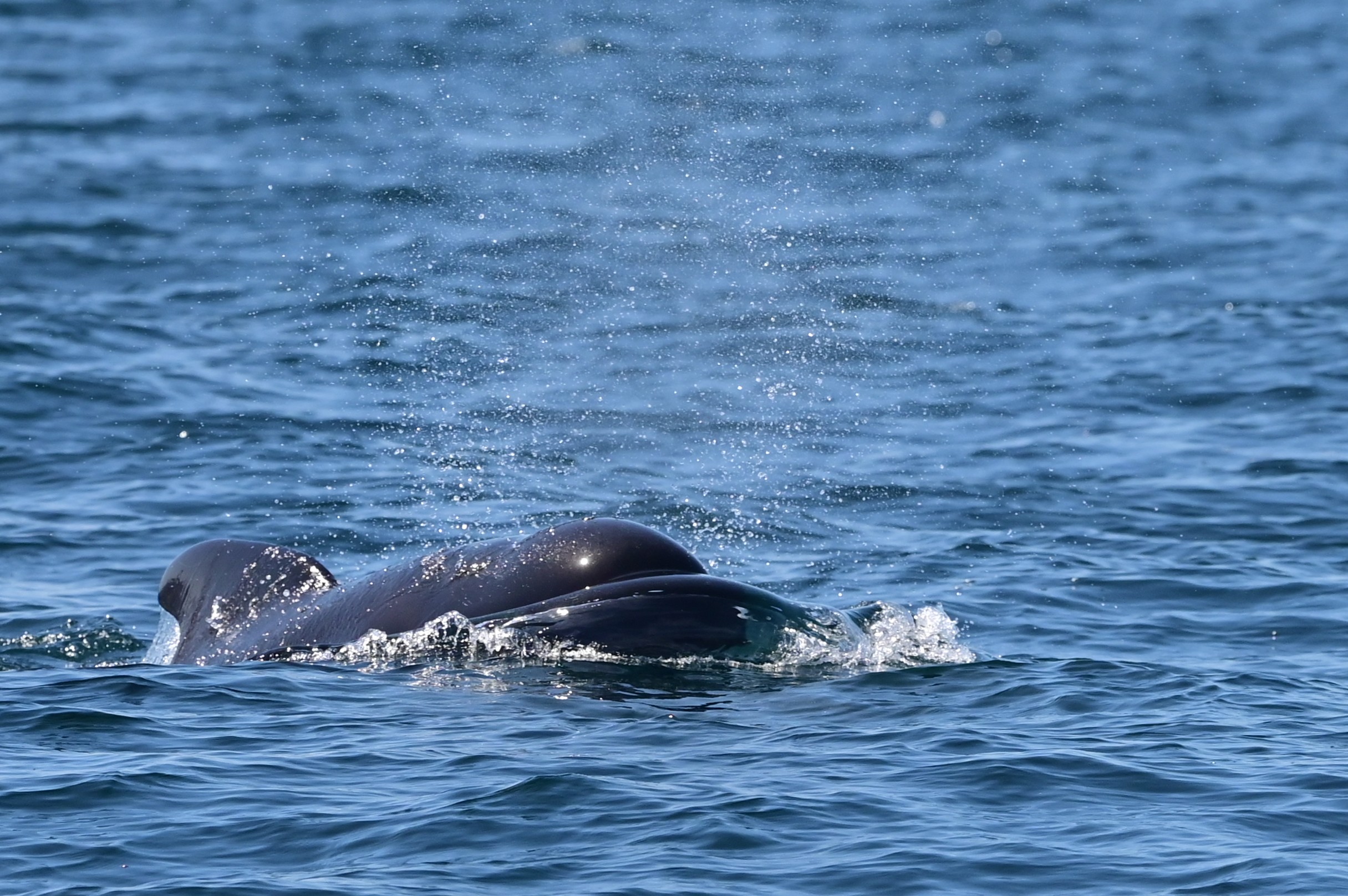 2) Nous avons eu la chance après la localisation d’un groupe de globicéphales, qu’ils se dirigent vers nous lors de l’approche en bateau (positionnement aux trois-quarts de leur direction et vitesse lente pour ne pas les effrayer). Certains sont venus très proches du bateau, chose très rare qui souligne notre bonne fortune.