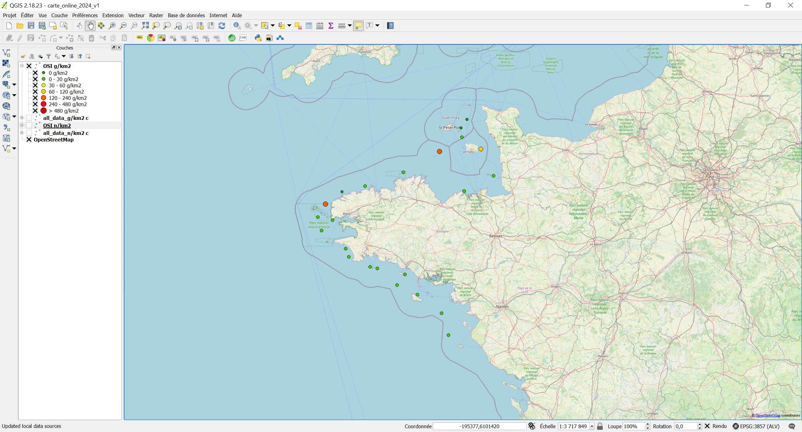 La carte ci-dessous vous montre les résultats. Une pollution plus importante des eaux est visible au large du Pays basque, proche du canyon sous-marin, au nord-ouest de Brest et à l’est de Guernesey, dans l’archipel anglo-normand.