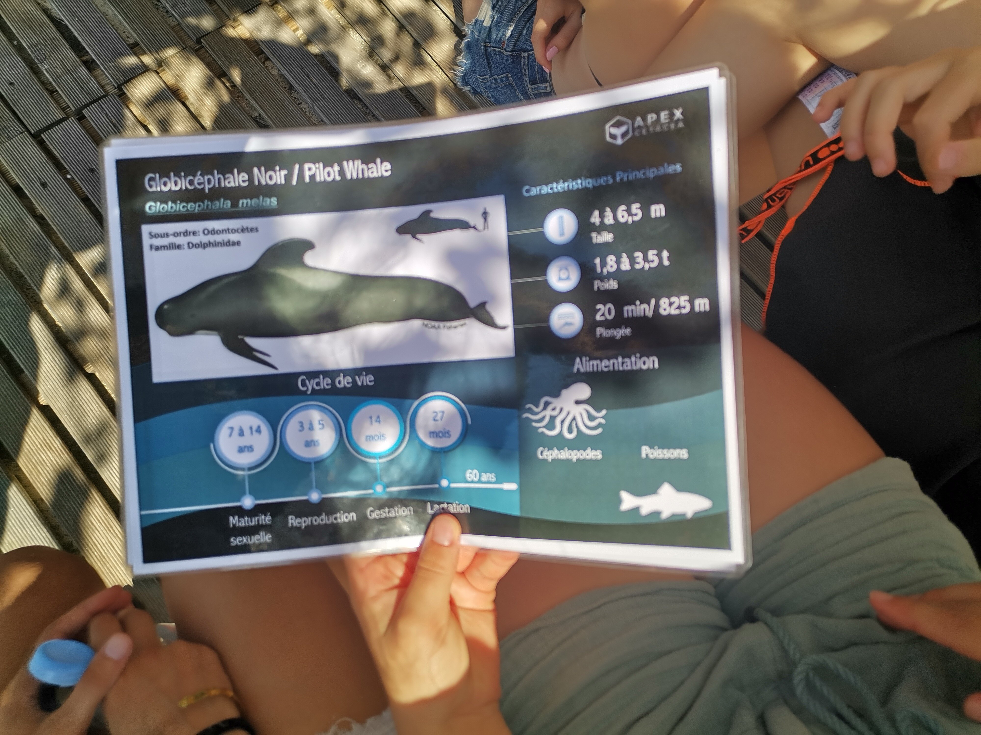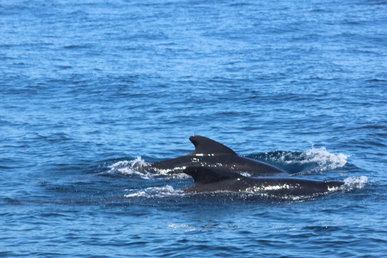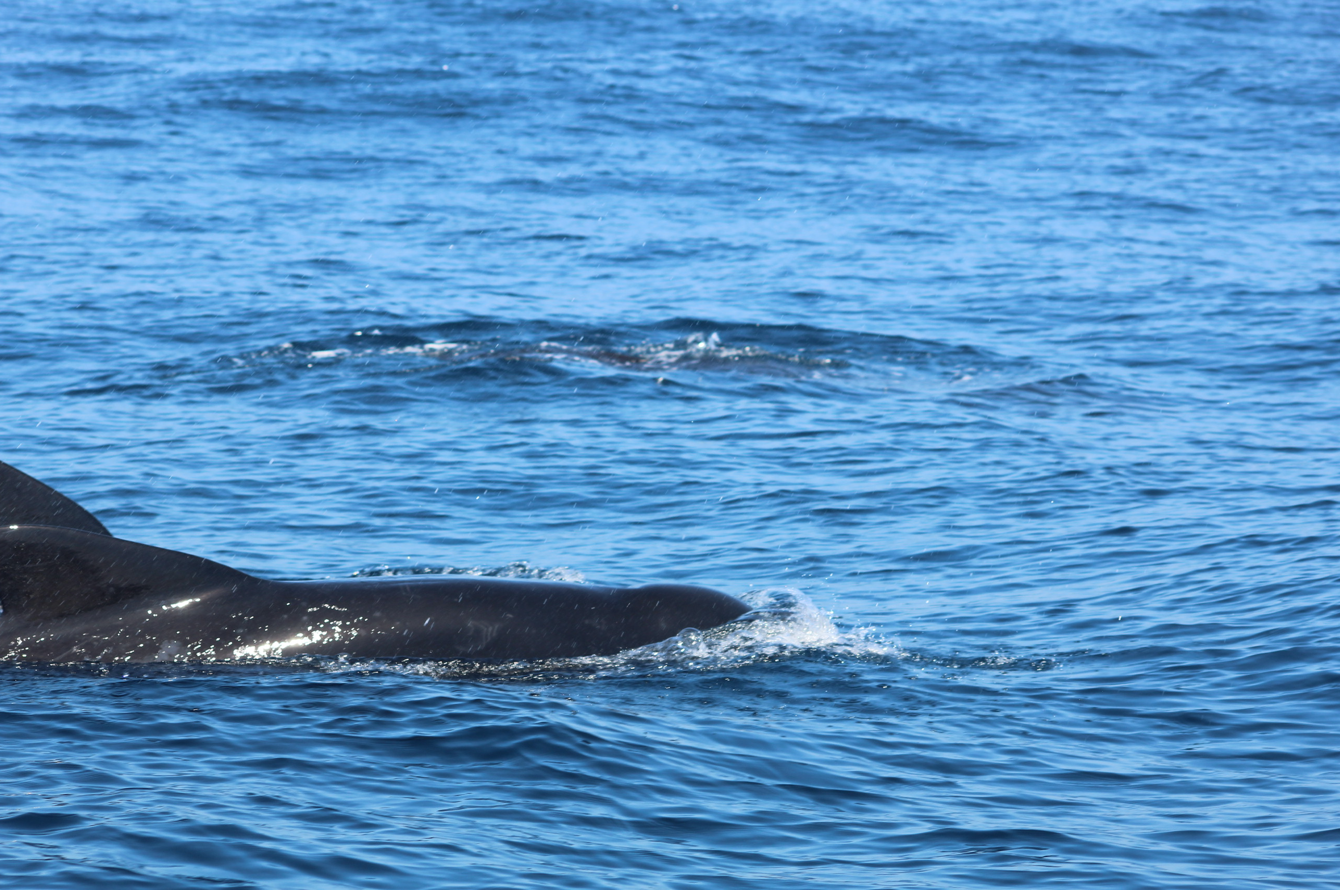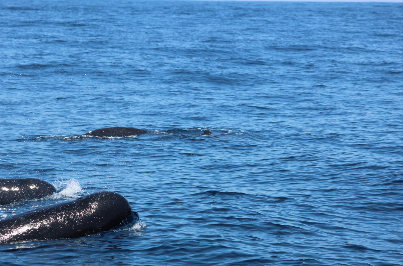 Ensuite nous avons eu l’incroyable chance de voir 6 globicéphales noirs (dont 1 grand mâle d’environ 7 mètres (la taille du bateau est d’environ 8 mètres 50), 1 femelle et 1 petit) !