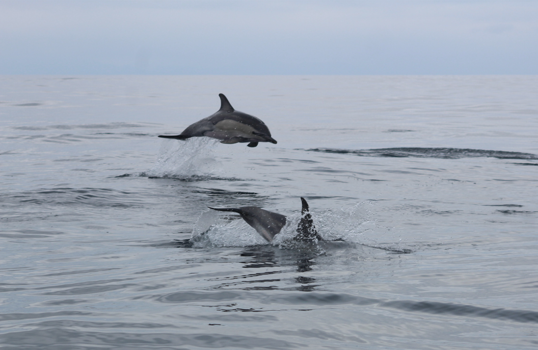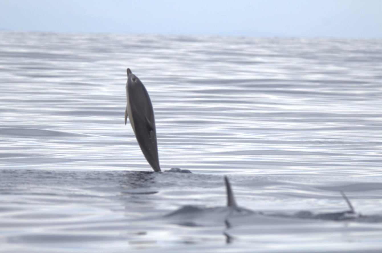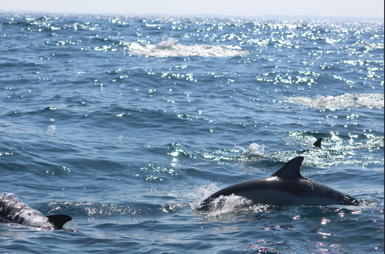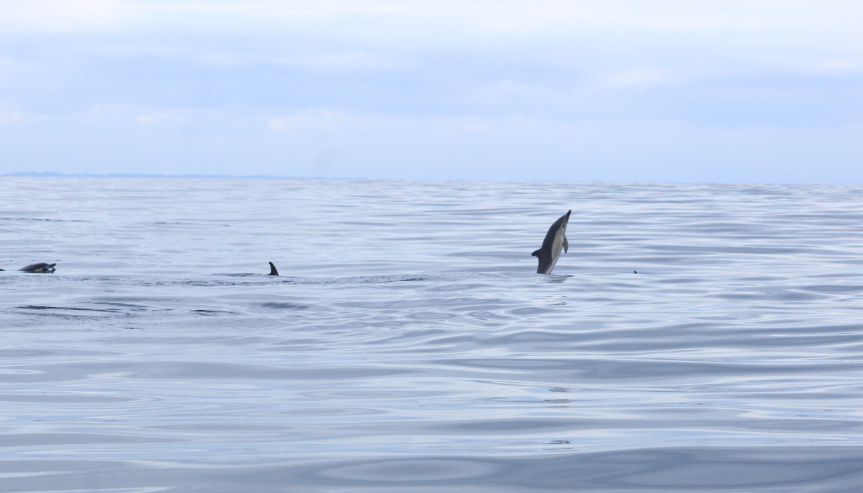 Au bout d’environ une heure à bord du bateau nous avons pu observer un pod de dauphins communs (il y avait environ 25 individus).