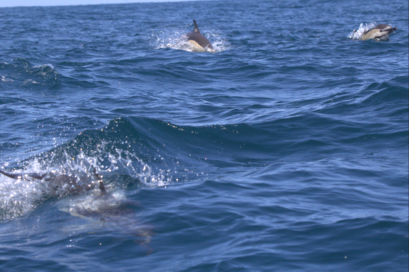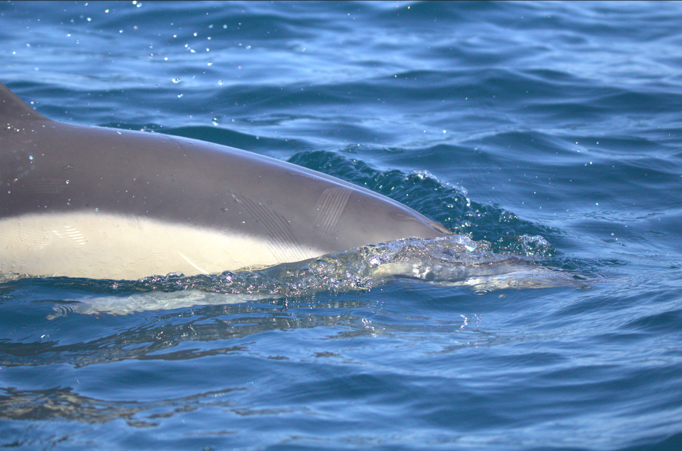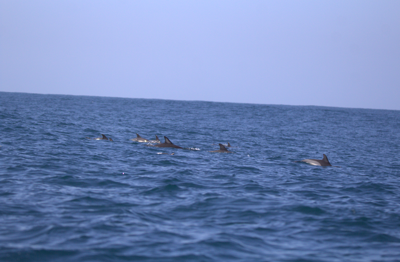 Au bout d’environ une heure à bord du bateau nous avons pu observer un pod de dauphins communs (il y avait environ 25 individus).