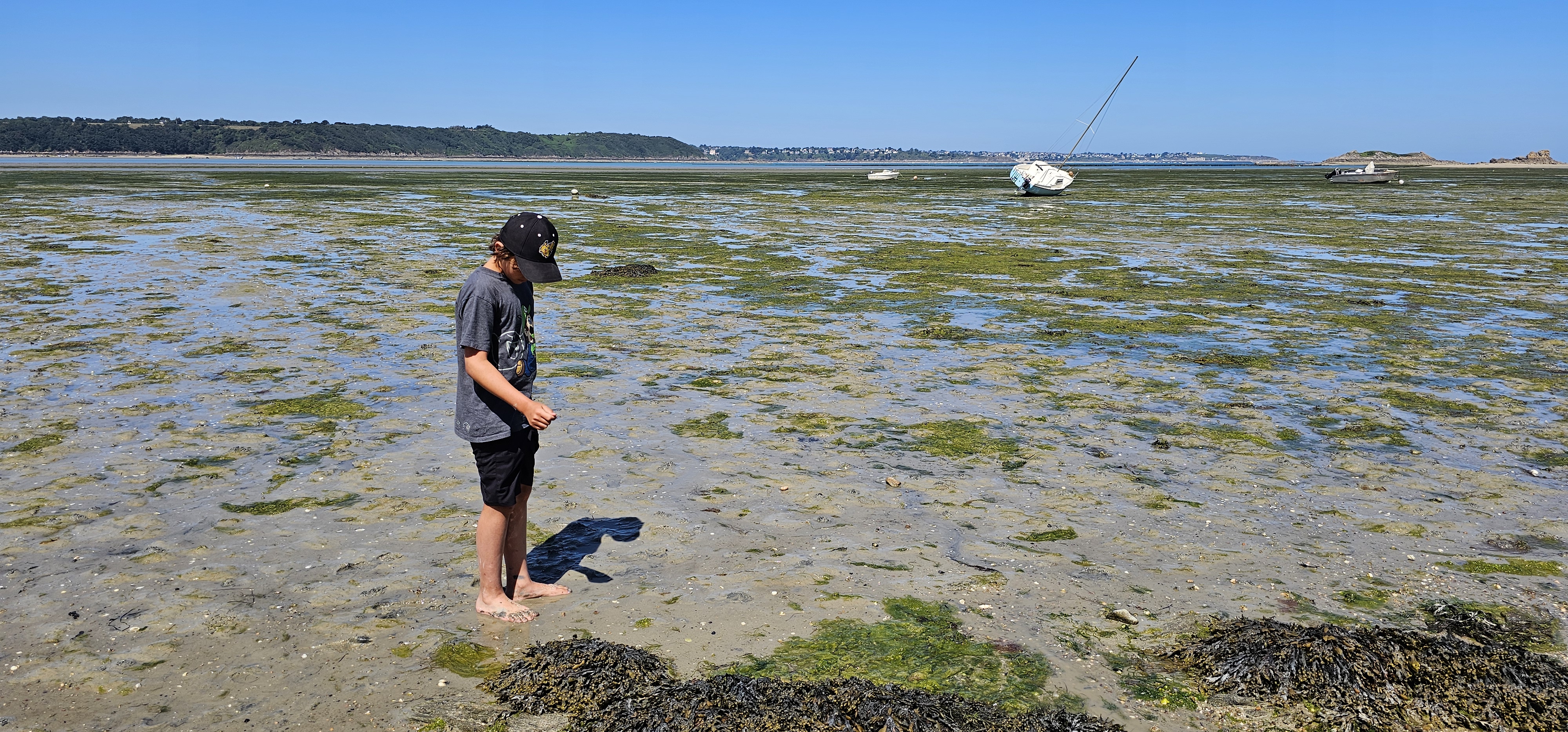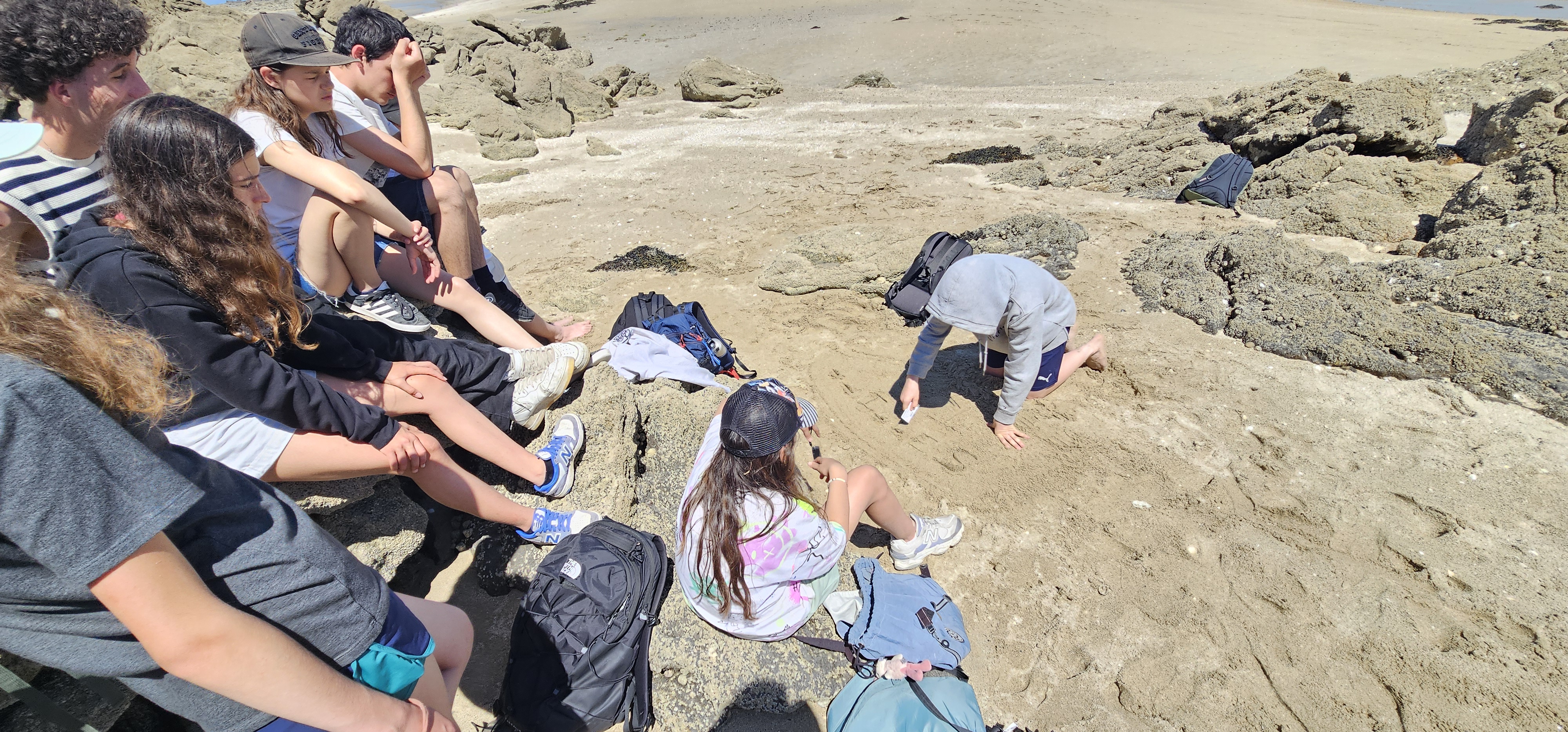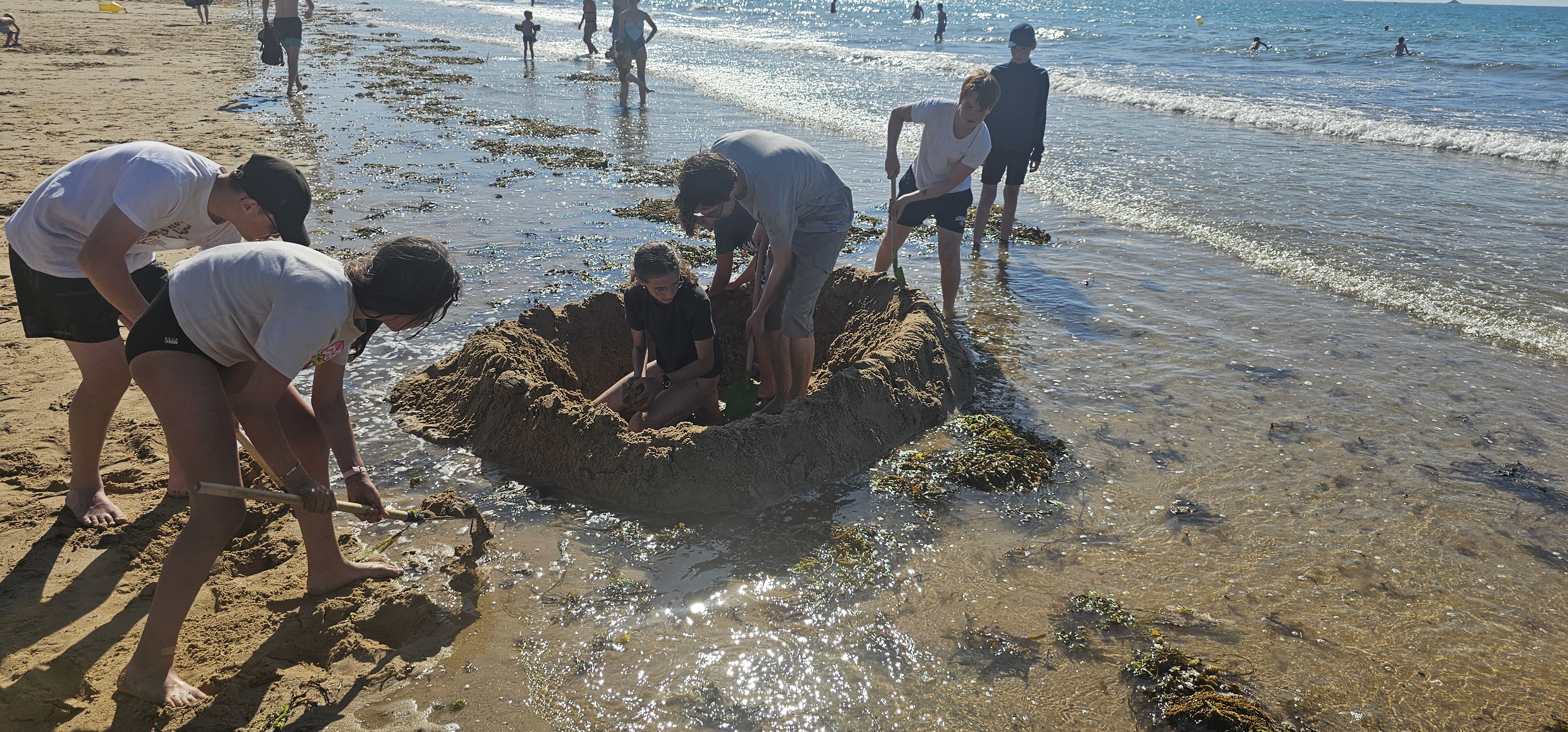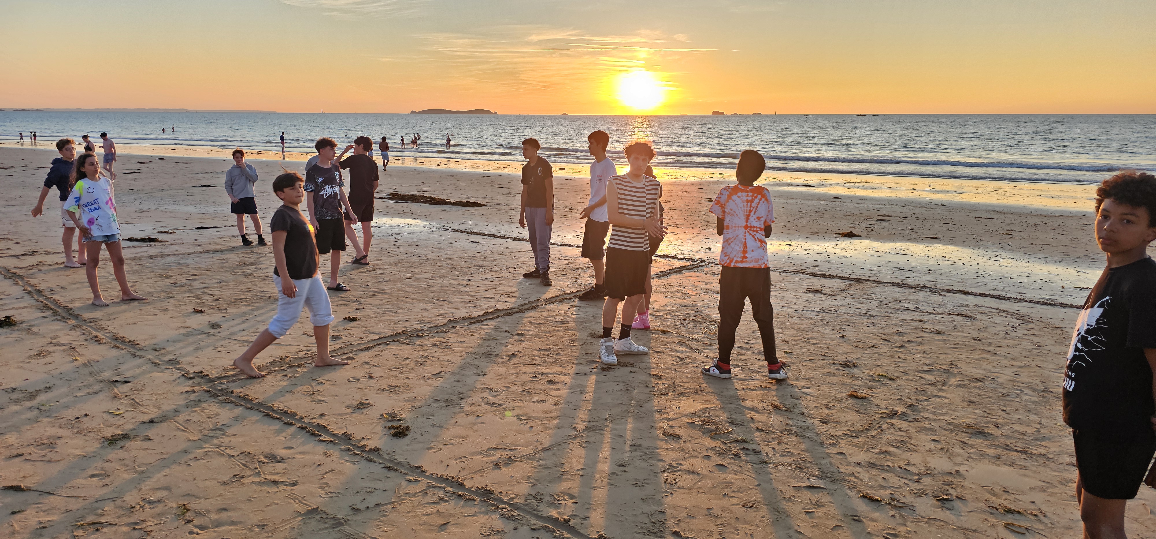 Ce matin nous nous sommes lever à huit heures et quart. Après le petit déjeuner avec des choix très restreint nous sommes ensuite partis vers la plage de Haas dans la ville de jacet la mer pour démarrer un protocole scientifique sur le bord de la plage. Le but du protocole était de placer un transect de vingt cinq mètres de long ou nous plaçons ensuite quatre quadrats dans ces quadra ,à l’aide d’une clef d’identification nous avons pus identifier les espèce. Après l’effort le réconfort, comme le dit si bien l’expression célèbre (surtout pour les ado) nous nous sommes autoriser à manger le repas qui était plein de calcule mathématiques pour pouvoir tout partager équitablement. Après le pic-nic nous avons suivis un long sentier avec beaucoup de vase et de sable. Là-bas certain faisaient de la grimpette ou cherchaient de beaux coquillages pour conclure nous remontâmes le même chemin qu’à l’aller. de retour au gite nous repartîmes à la plage pour faire des grands trou avec des grands remparts mais la mer monter et nos châteaux se firent tous engloutir. Sur le chemin nous croisâmes des camions qui vendait des saucissons et des bananes.