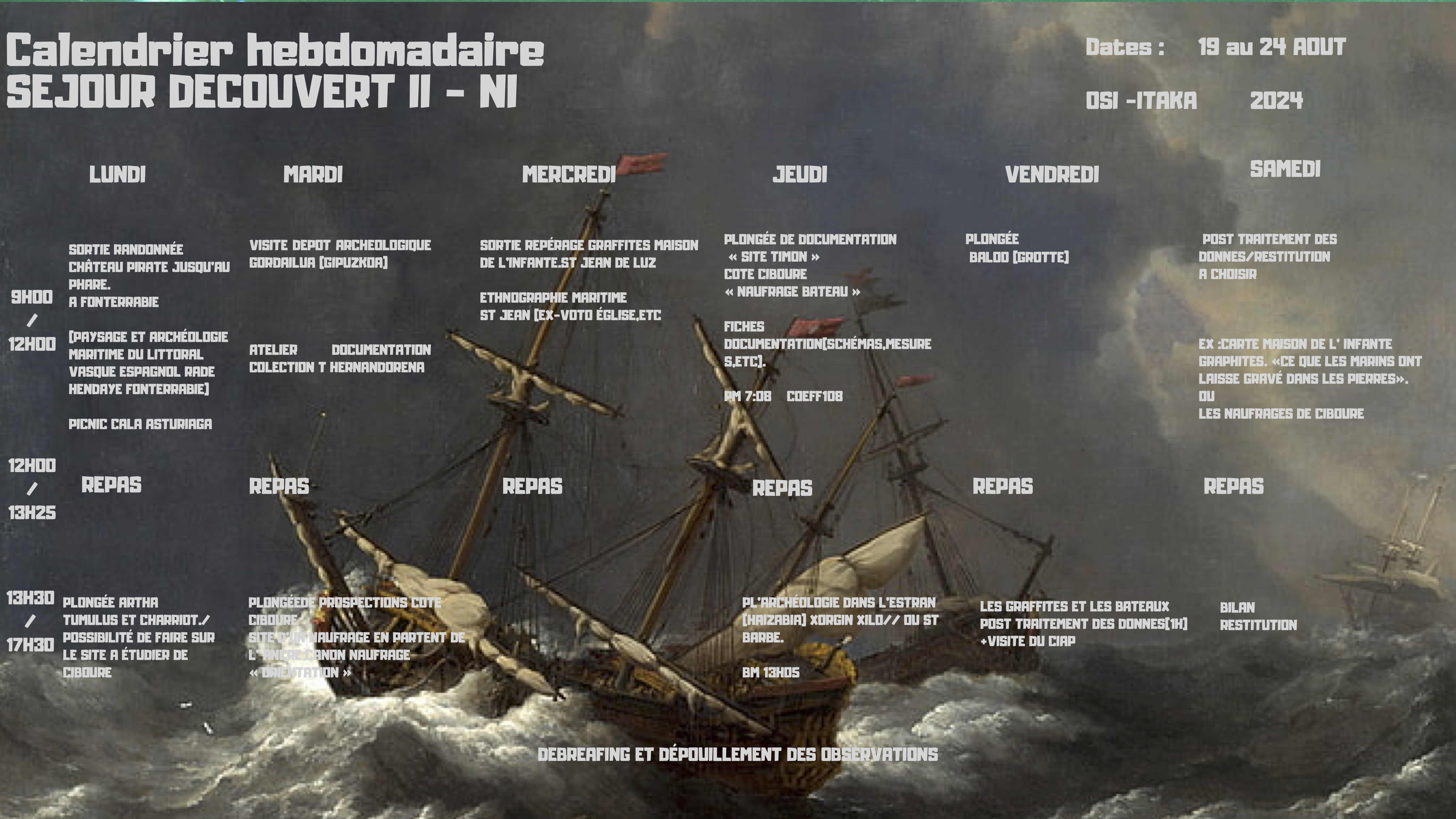 Accueil > Actions et journaux de bord > Journaux de Bord des Opérations > Vacances Scientifiques > Archéologie sous-marine - 18 au 25 aout 2024