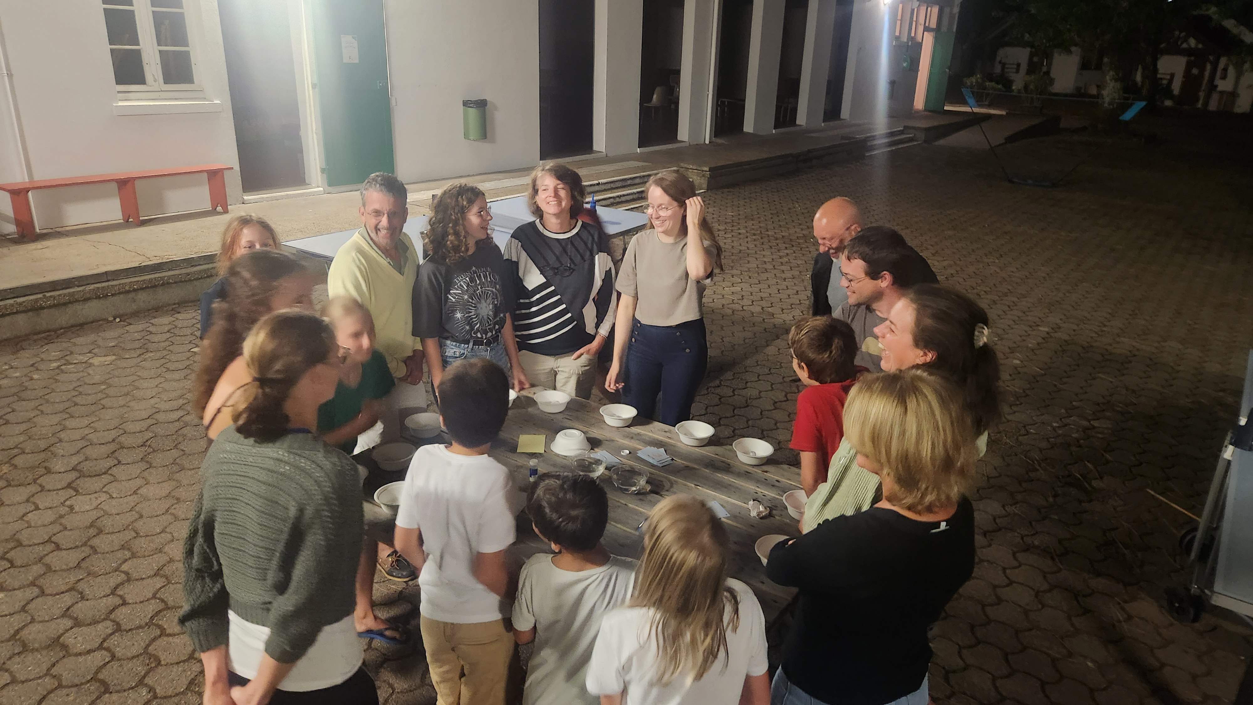 Tout le monde est bien arrivé et semble de bonne humeur. Après quelques jeux de présentations, nous avons pu partager un apéritif offert par Manu, le maître des lieux. Un repas excellent nous a été servi : carottes râpées, volaille et semoule/courgettes, avec une île flottante en dessert. Merci Frank, le chef cuistot).