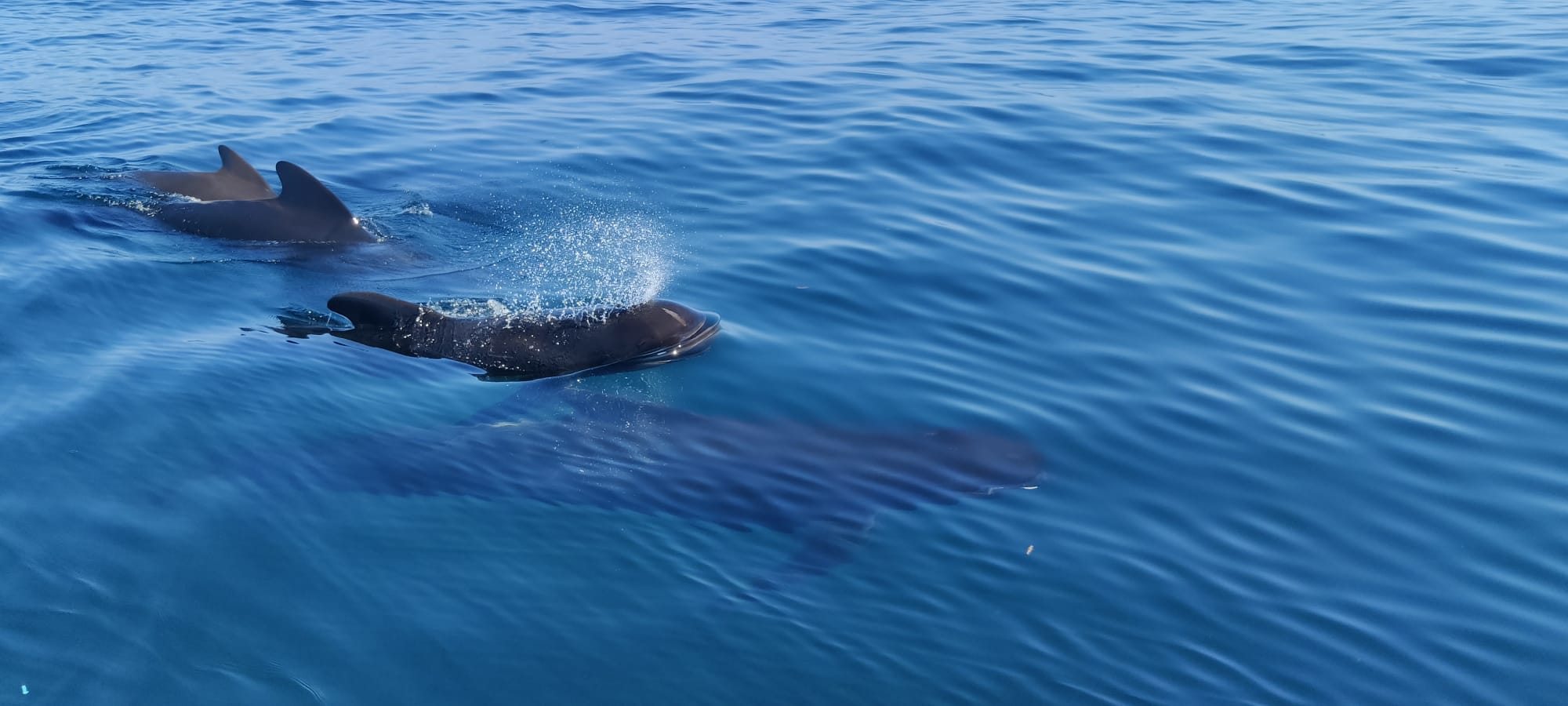 De bonnes conditions : peu de vent, peu de vagues mais des nuages. Ce qui nous permet d’enchainer les observations : Grand Dauphins, Globicephales, Dauphins bleu et blanc par centaine. Beaucoup sont venus à l’étrave et nous sommes restés autour d’un groupe mixte au repos pendant trente minutes, exceptionnel...