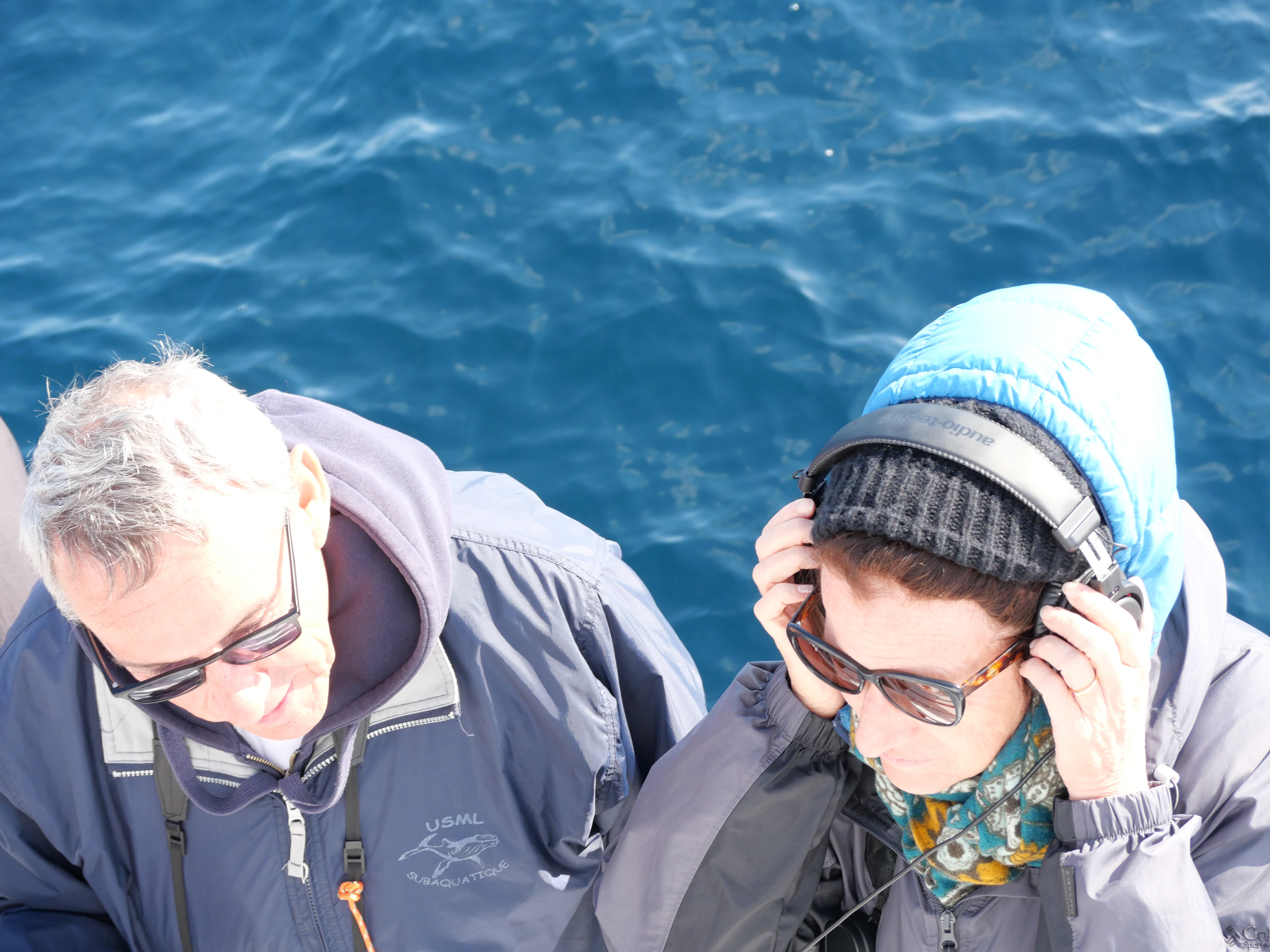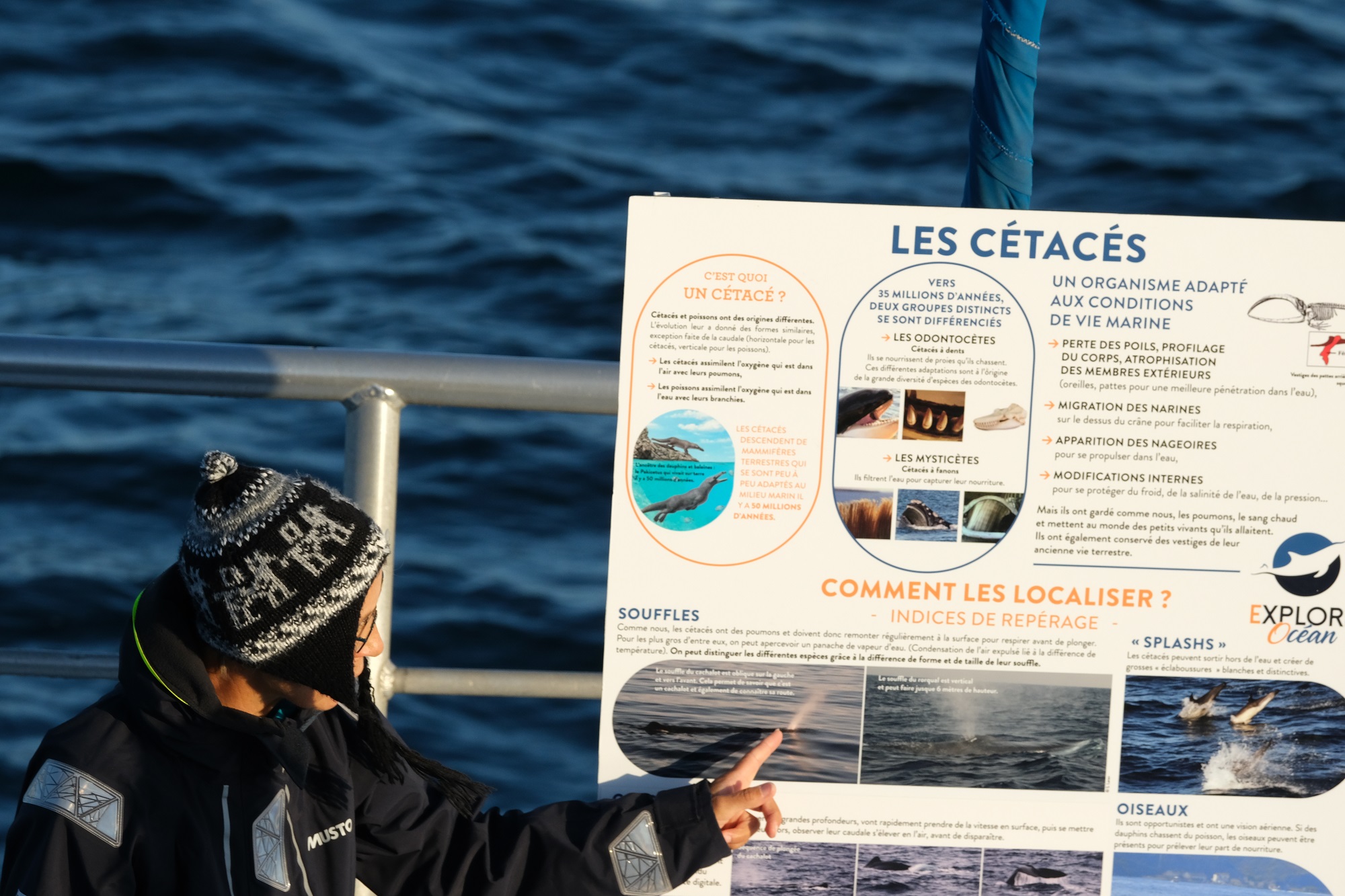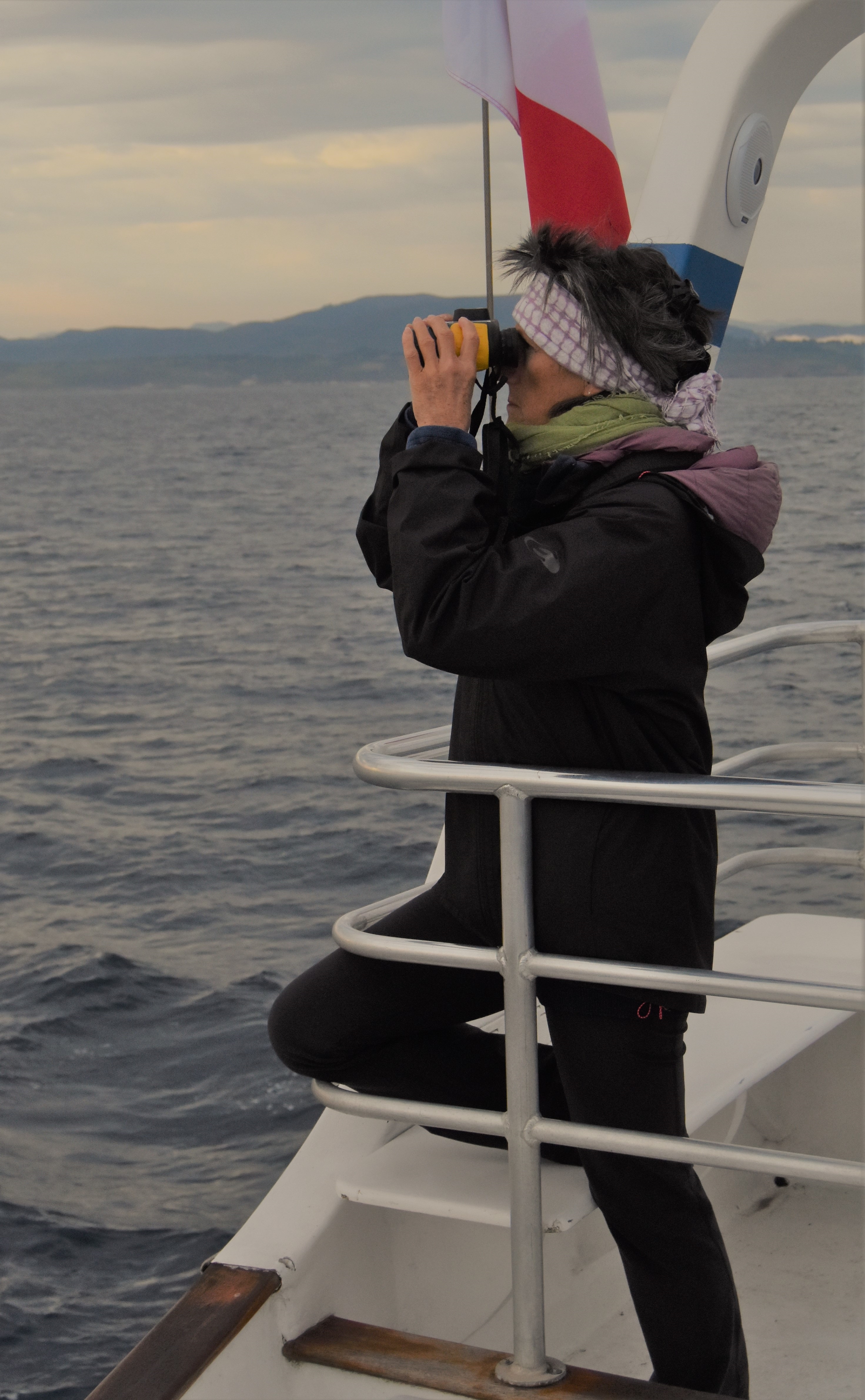 Des touristes se joignent à nous sur le bateau ainsi qu’une bénévole spécialiste de l’observation de cétacés.