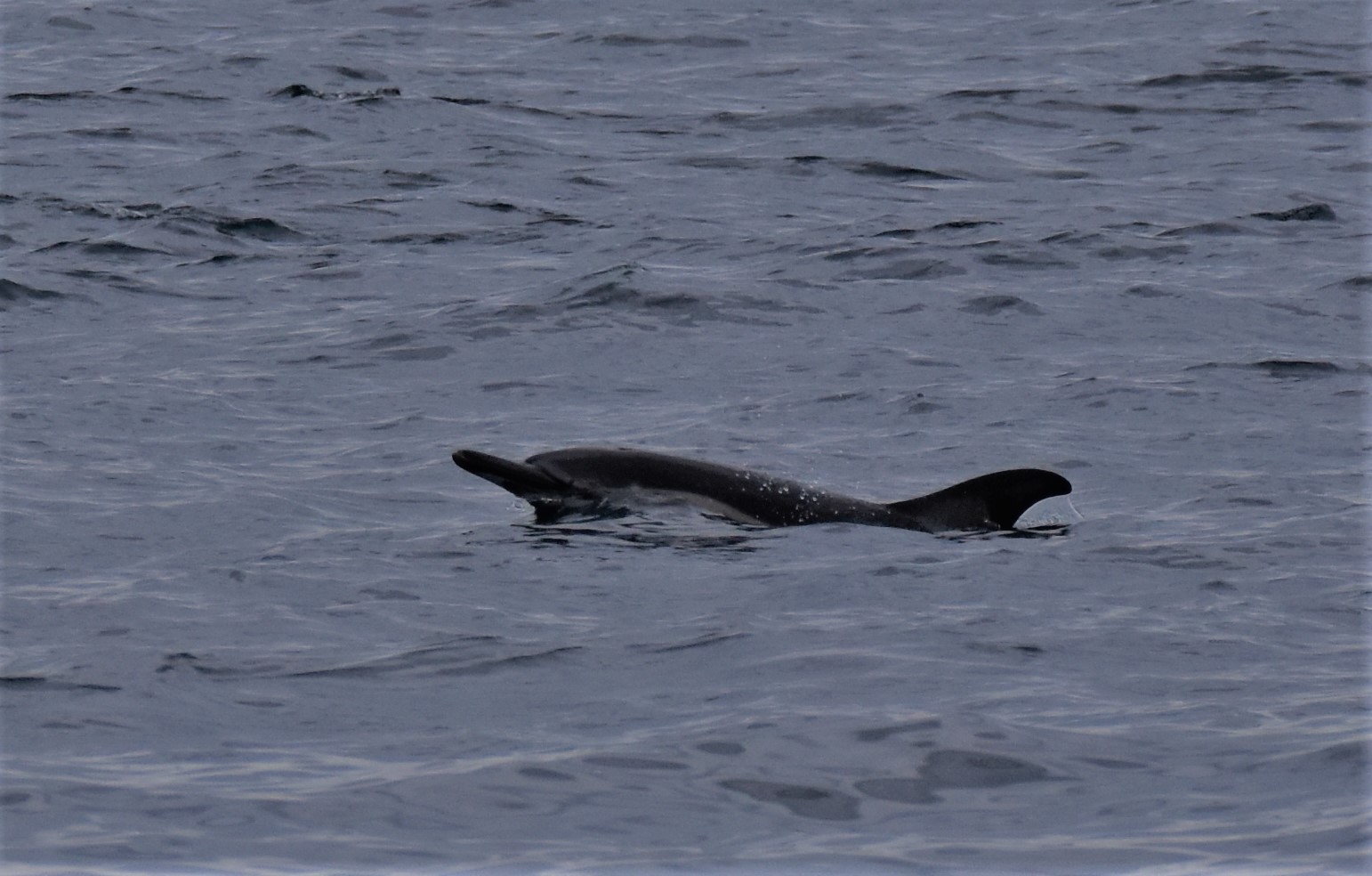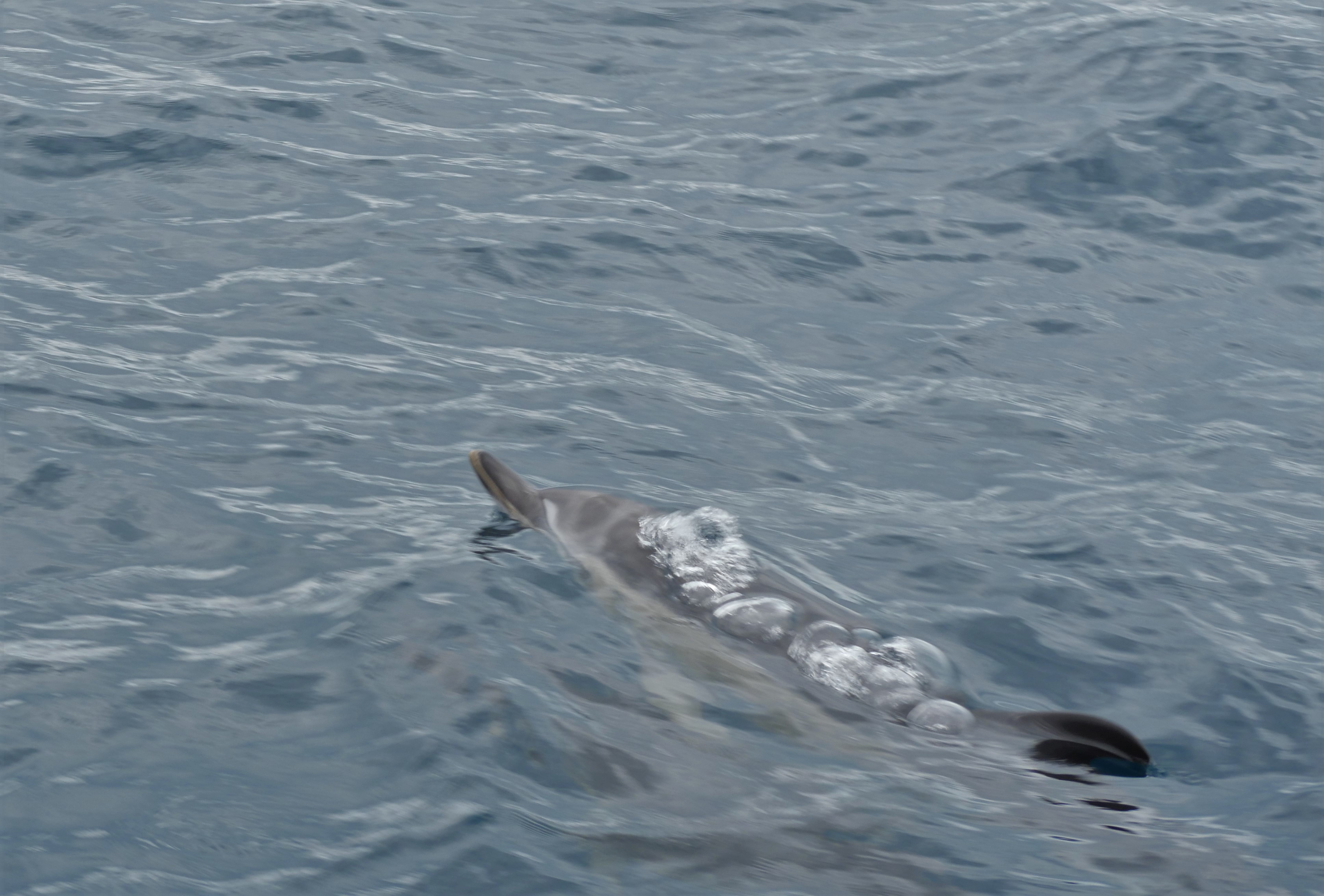 Très peu de temps après à 14h59 nous apercevons quelques ailerons assez loin droit devant le bateau, cette fois ce sont des dauphins. Le bateau se déroute pour s’approcher d’eux. Nous avons pu les observer de près et déterminer que le groupe était constitué de 2 espèces différentes : des dauphins communs et des dauphins bleus et blancs. L’euphorie règne à bord.