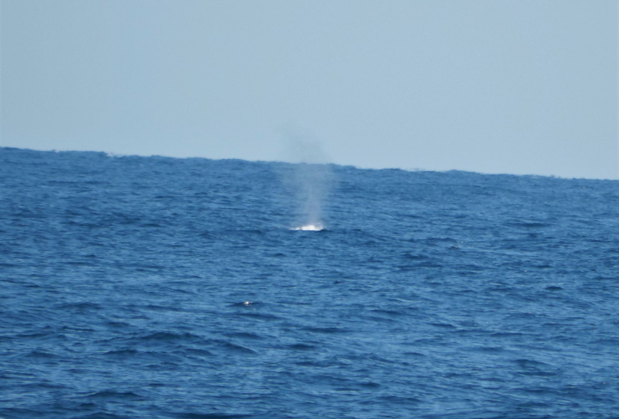 Après une matinée très froide, le soleil est de retour et nous apprécions vraiment de pouvoir ôter nos bonnets et vêtements chauds. A l’issue de la dégustation des cakes du déjeuner, à 13h49 un souffle est identifié au loin devant le bateau. Nous sommes tous en alerte maximum.