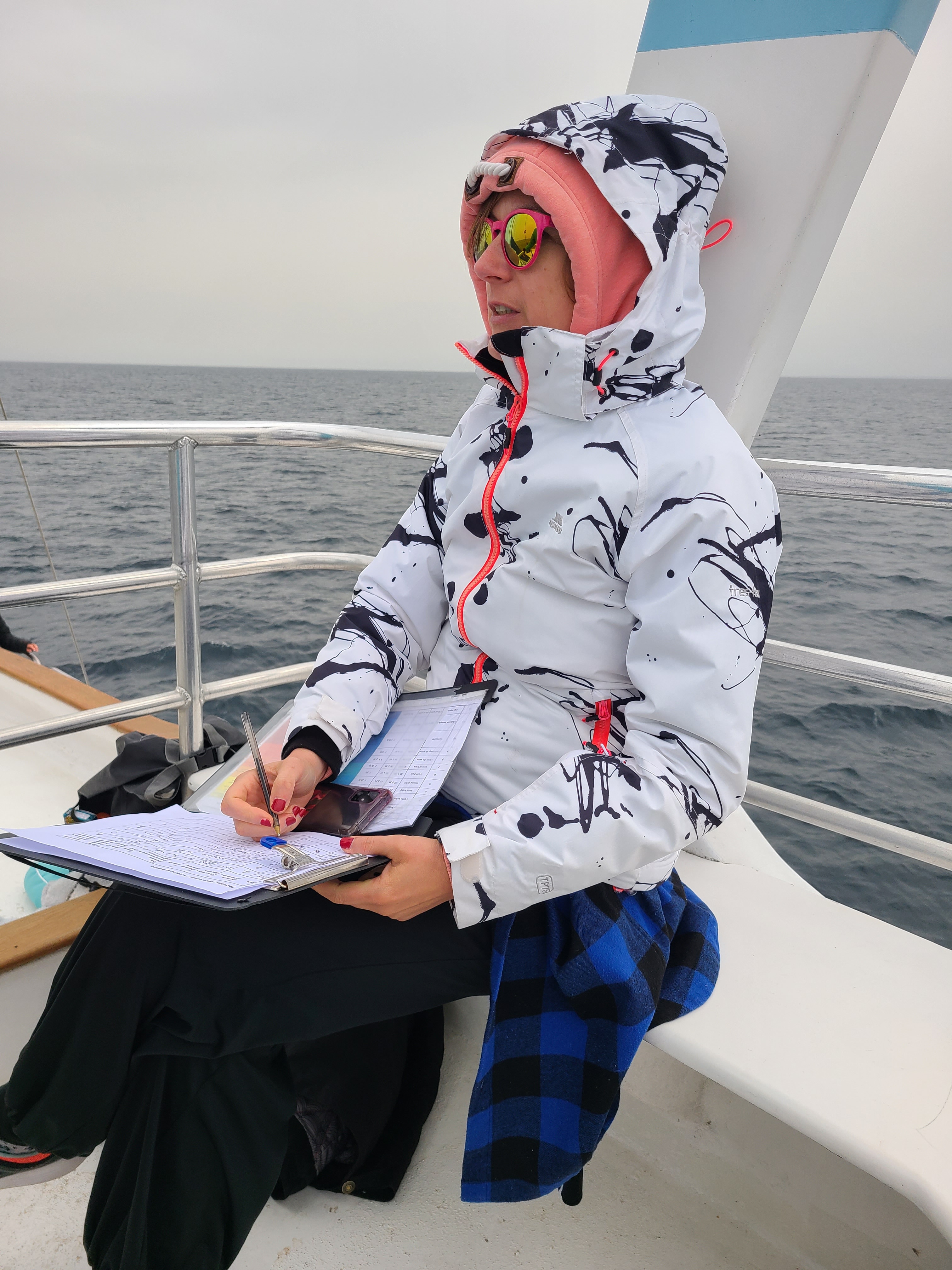 Beau temps. Mer calme. On embarque sur le catamaran avec une classe de CM1. Le travail s’intensifie. En plus des tours d’observations, on va poser un filet manta pour analyser la pollution au plastique. L’observation commence avec quelques dauphins communs. Et une pluie de fous de Bassan. On leur a donné ce nom car, pour pêcher, ils tombent à toute vitesse dans l’eau, avalent le poisson sous l’eau et décollent à nouveau. Les marins les prenaient pour des fous car ils pensaient qu’ils se jetaient à l’eau pour rien. Ensuite, on a fait la rencontre, inattendue et extrêmement rare dans la région, d’une baleine à bosse. On prend le repas du midi sur le pont supérieur, histoire de se remettre de nos émotions. Mais on se fait déranger par environ 80 grands dauphins qui font des sauts pour les gamins ravis. Après la pause du filet, alerte baleine droit devant. Quelques globicéphales et un petit rorqual plus tard, on rentre fatigués mais heureux pour écrire le carnet de bord, trier les données comme les photos et traiter l’échantillon d’eau filtrée.