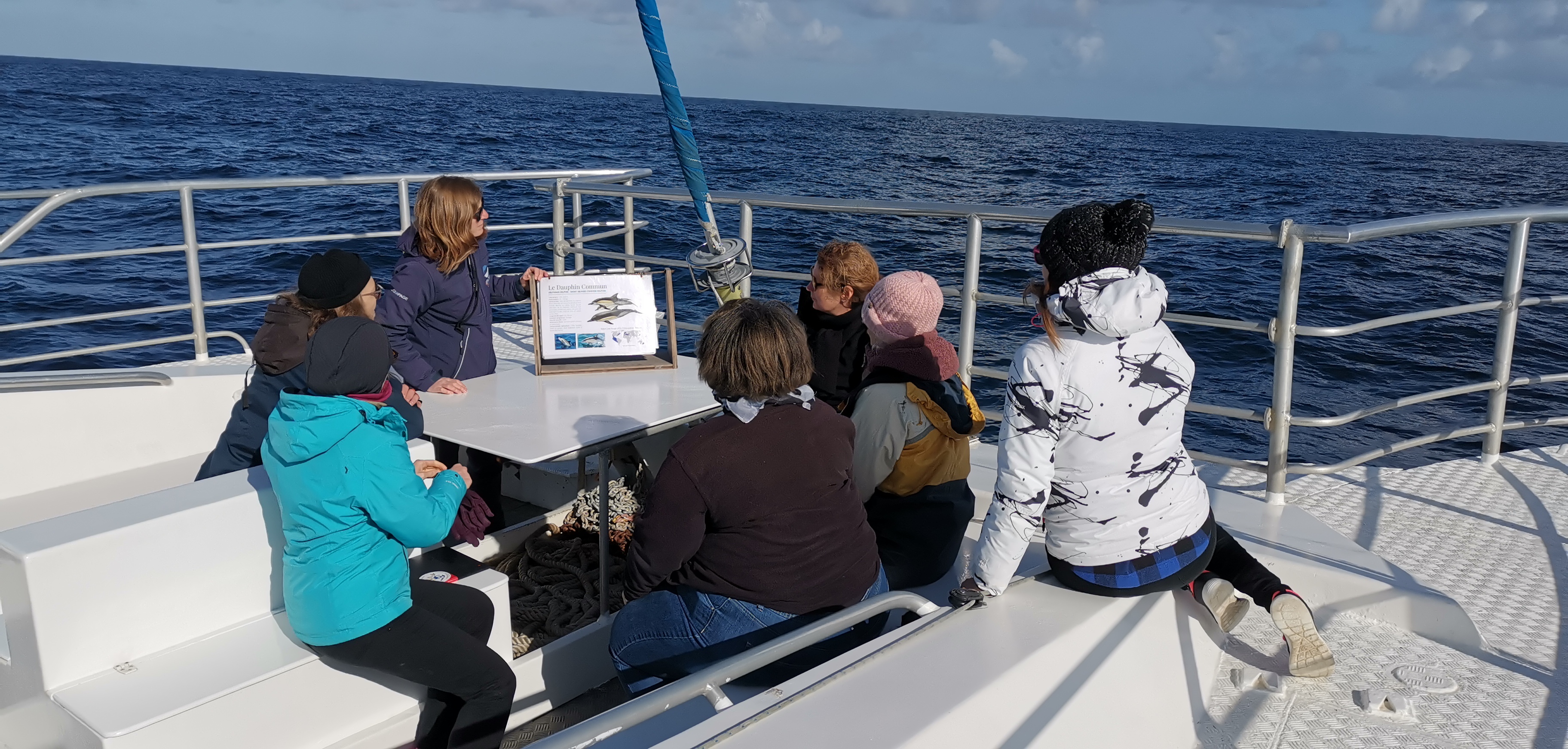Anne nous a fait une super introduction sur les cétacés. PUIS : LES GLOBICEPHALES ET LES GRANDS DAUPHINS SONT ARRIVES !! On a pu en voir de plusieurs tailles ainsi que des jeunes d’un an environ et des nouveau-nés. Certains dauphins étaient très proches et sont même passés sous le bateau, nous avons de belles photos à partager ! On a eu quelques petits passages de mal de mer mais rien ne nous arrête #teamdewarrior.