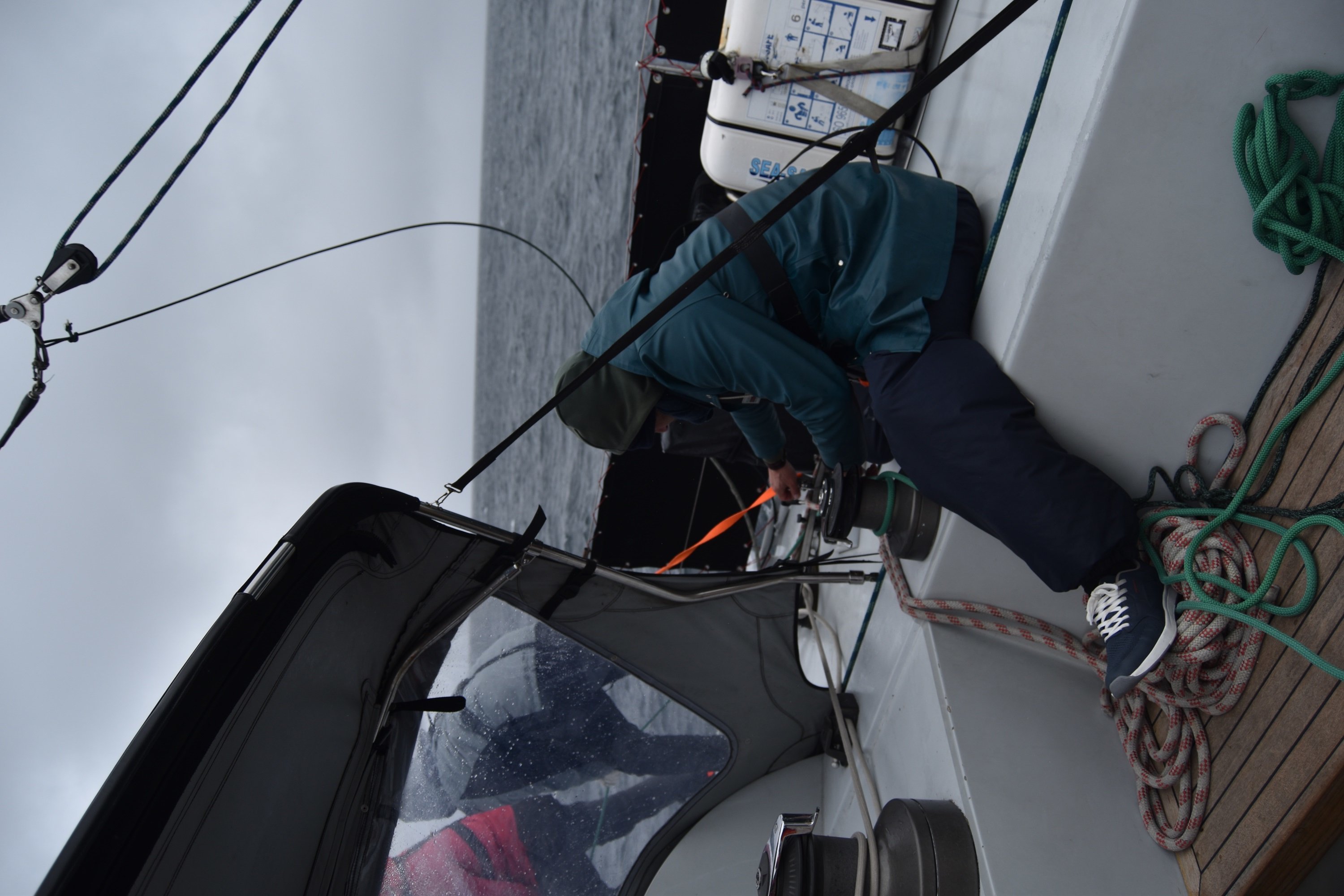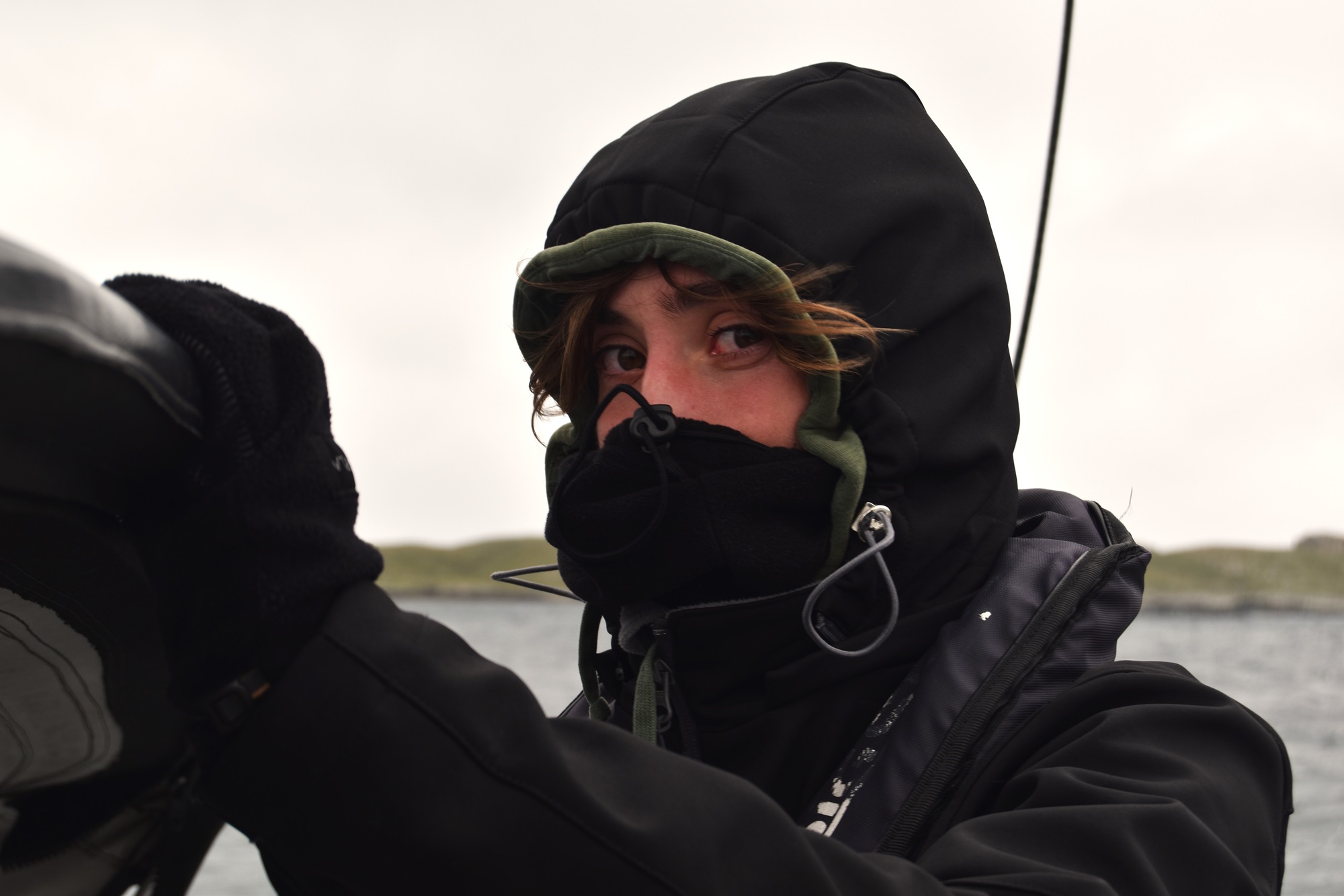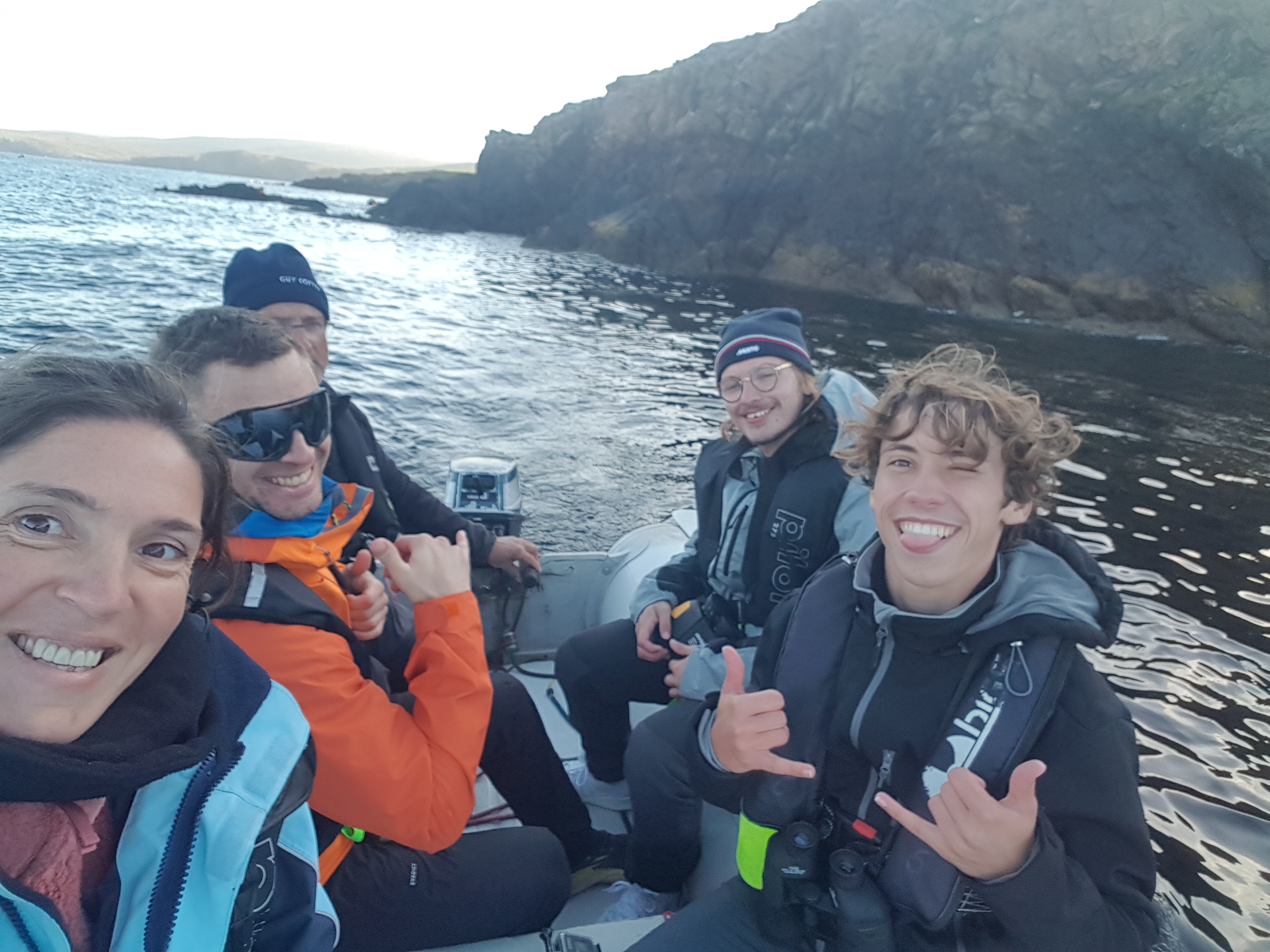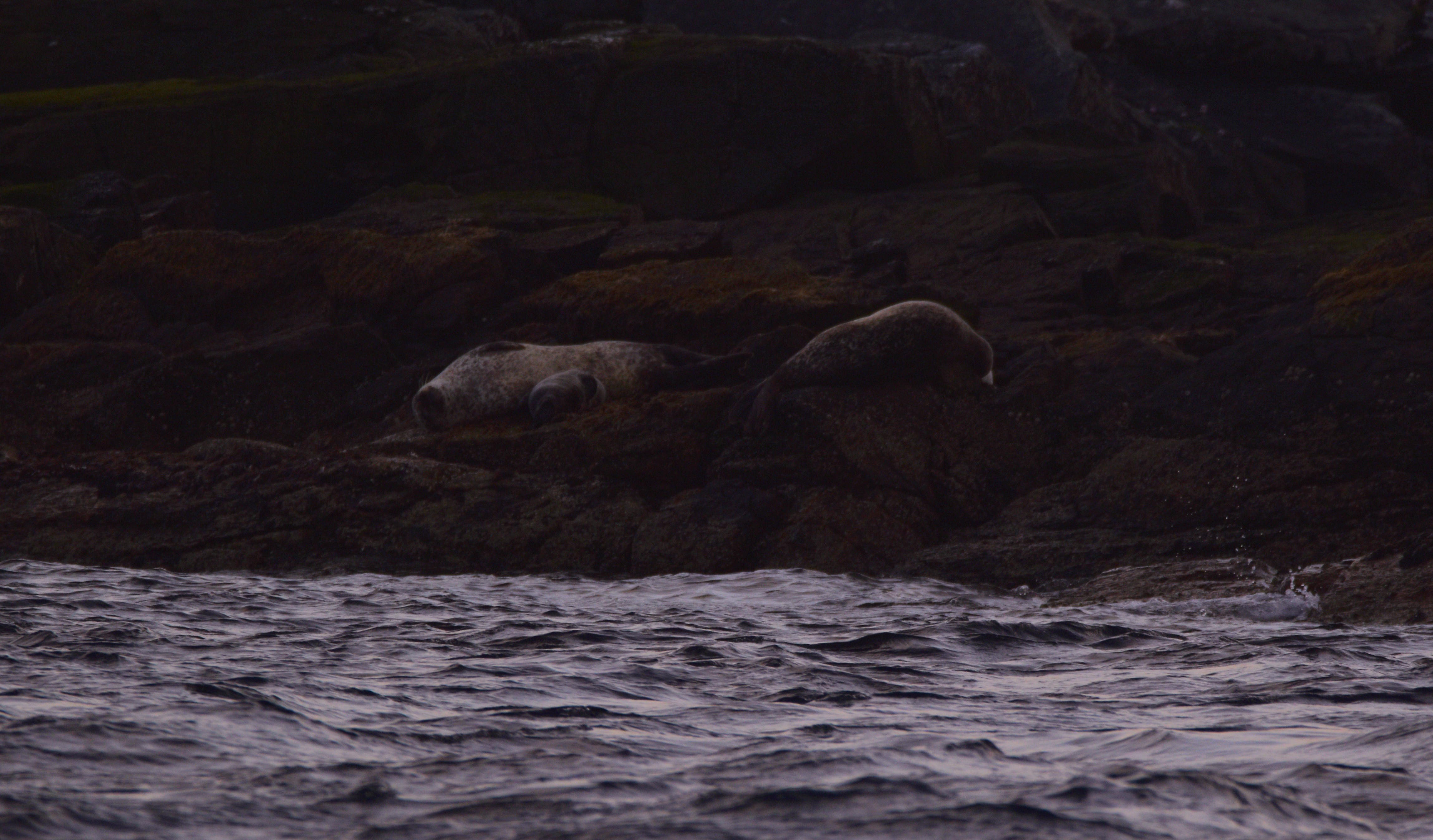 On profite de ces premières heures de navigation, même si le mal de mer, la fatigue et le froid s’installent et ont raison de Kerwann, Kian et Servane.Enfin le soleil fait son apparition, nous jetons l’ancre dans une baie magnifique où deux phoques gris nous tiennent compagnie et jouent à cache-cache pendant qu’un petit groupe essaie de les approcher de plus près avec l’annexe. On coupe le moteur pour essayer de s’approcher un peu plus, mais peine perdue, les animaux sont méfiants… alors Max nous ramène à la rame.