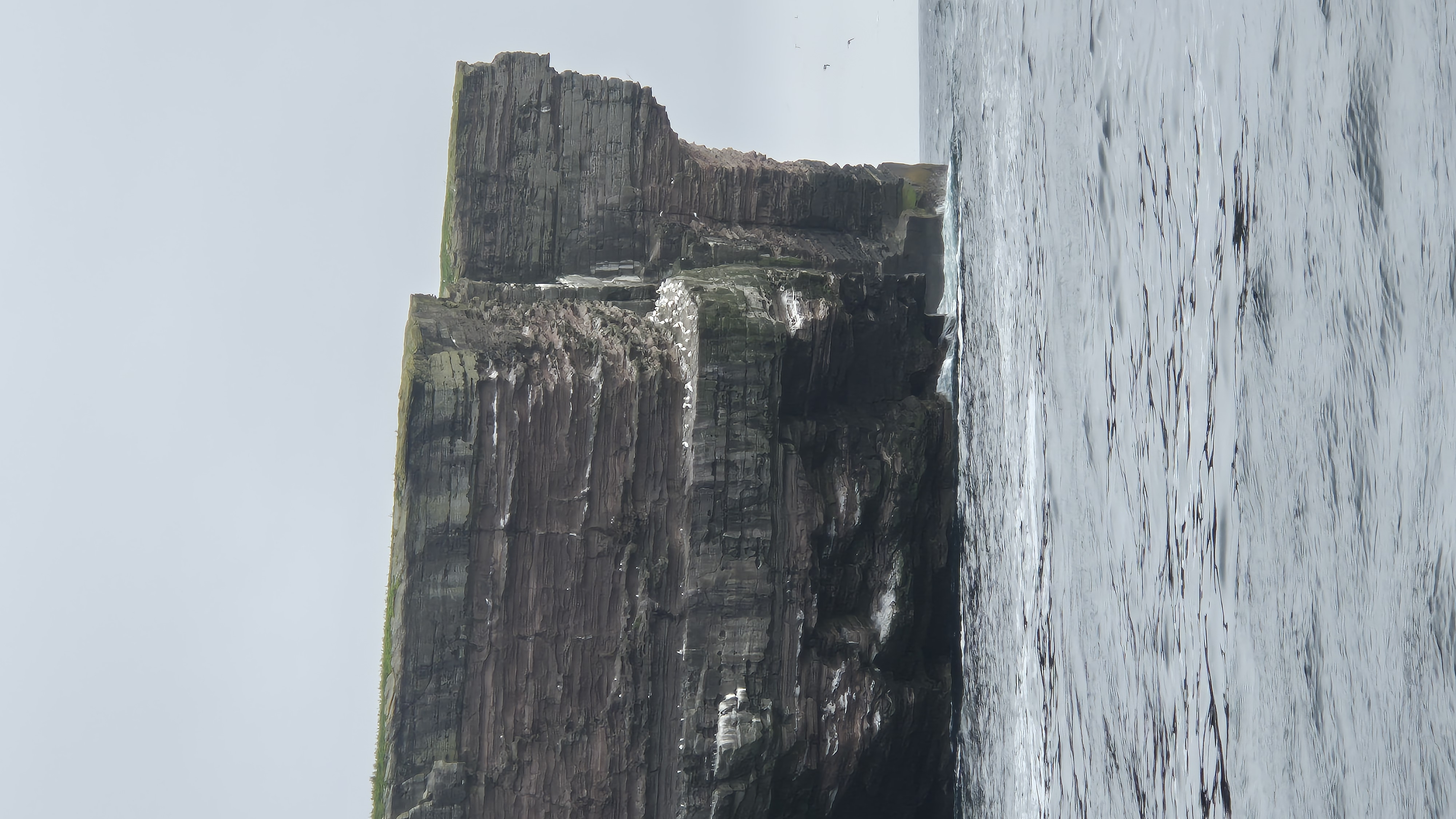 Le temps est plus clément, le soleil se montre régulièrement. Nous repassons au ras des falaises de Noss près des colonies de macareux et de fous, le spectacle des oiseaux volant tout autour du bateau est toujours aussi magnifique. Olivier garde un œil en l’air, un œil sur les falaises qui sont très proches, ça passe juste !