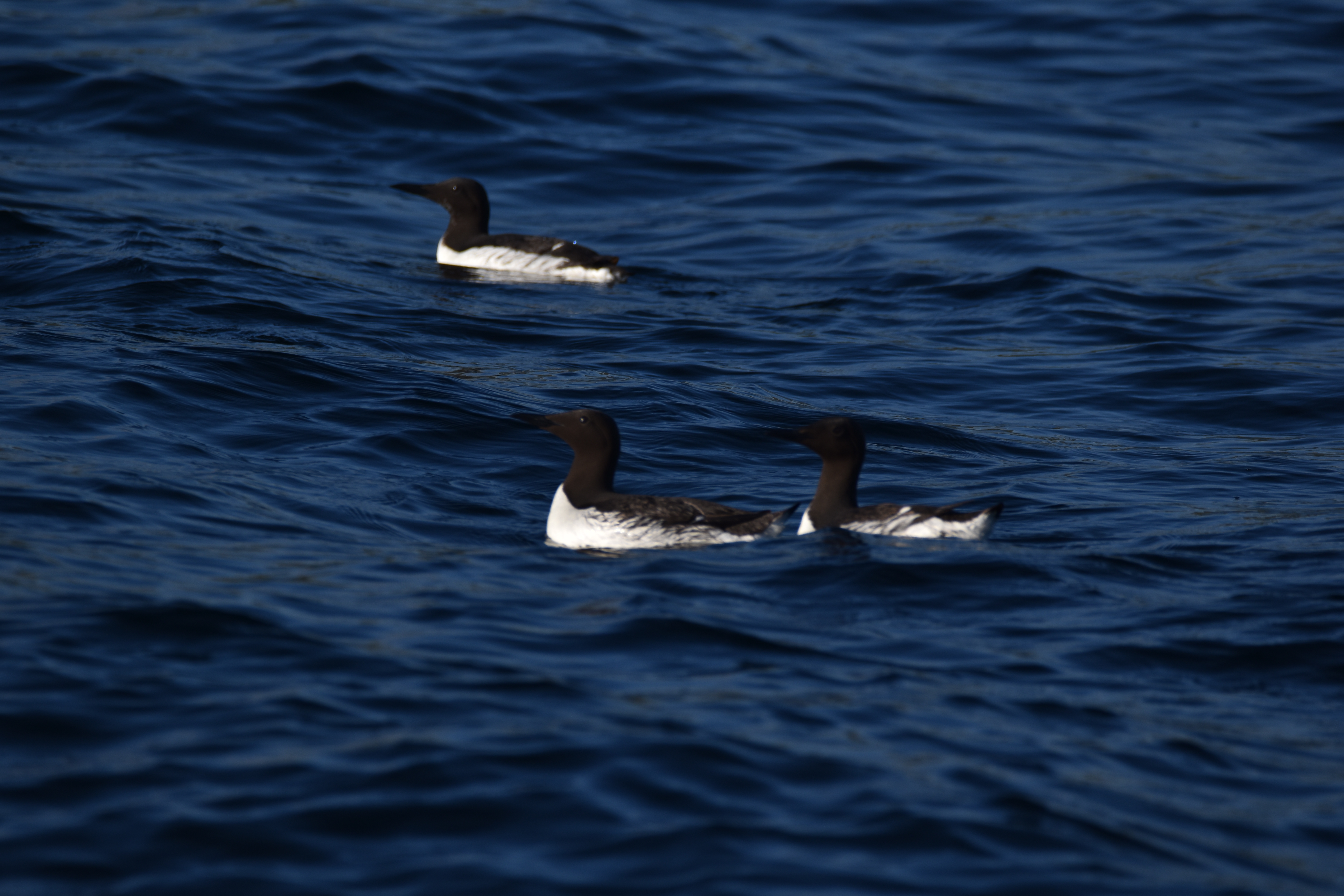 La grand voile est hissée sous un premier grain et la navigation prend forme. Les quarts de veille s’organisent, on voit des ailerons partout… qui ne sont en fait que des illusions, la mer n’est pas d’huile ! On observe des oiseaux : macareux moine, pingouins torda, guillemots de Troïl, fous de bassan qui volent en escadrille. C’est magnifique !
