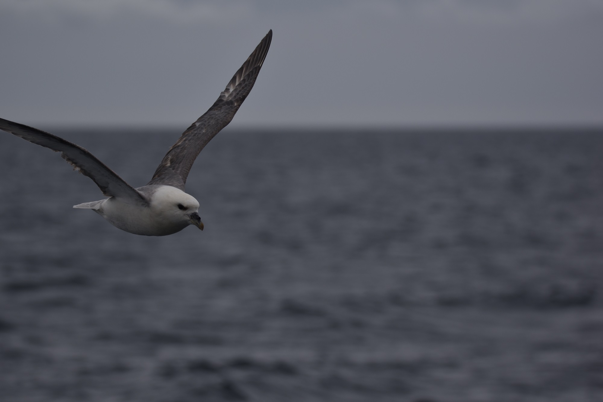 On est parti plus tôt que d’habitude pour éviter la tempête qui arrivait. La journée n’a pas été très riche en mammifères marins à part quelques ailerons aperçus au loin vers la fin de matinée. On a quand même eu le droit à un petit spectacle d’oiseaux, moins impressionnant que lundi mais différent. Il y avait des Fulmars Boréals qui tournaient autour du bateau à une 50aine de centimètres de nous. Ils ont fait plusieurs tours avant d’être rejoints par d’autres et de s’éloigner du bateau. J’ai trouvé ce moment magique car c’est la première fois que je voyais un oiseau en plein vol d’aussi près, surtout que le vent était fort et le bateau était rapide.