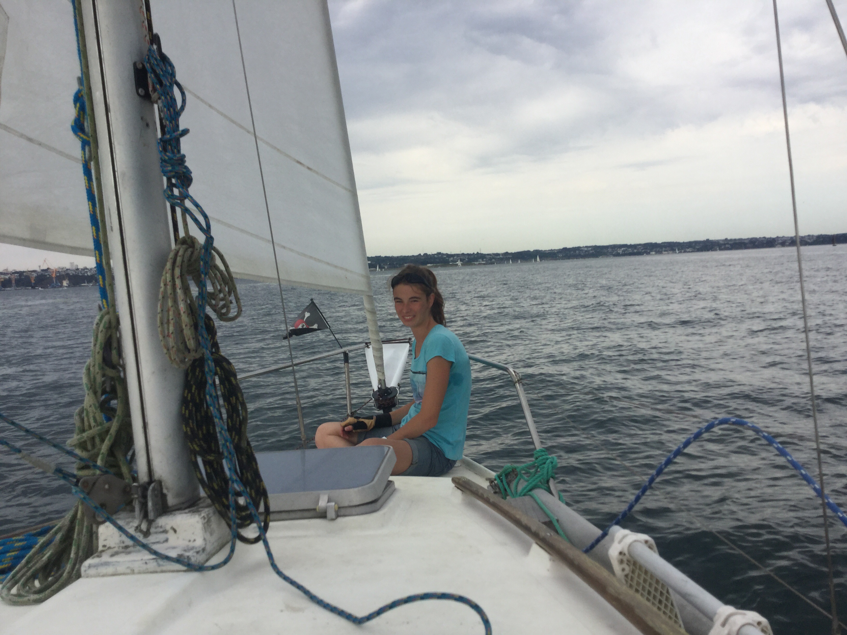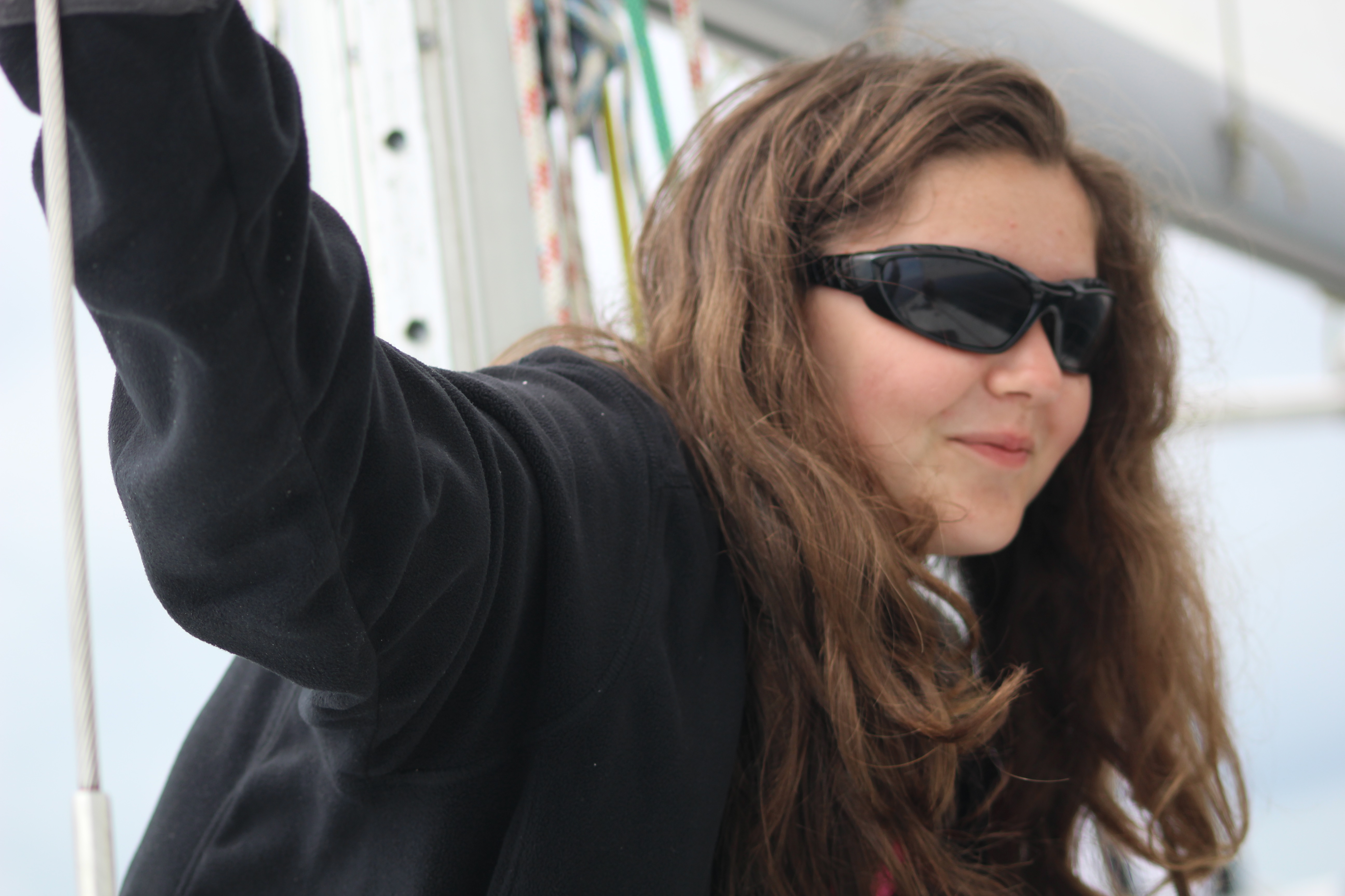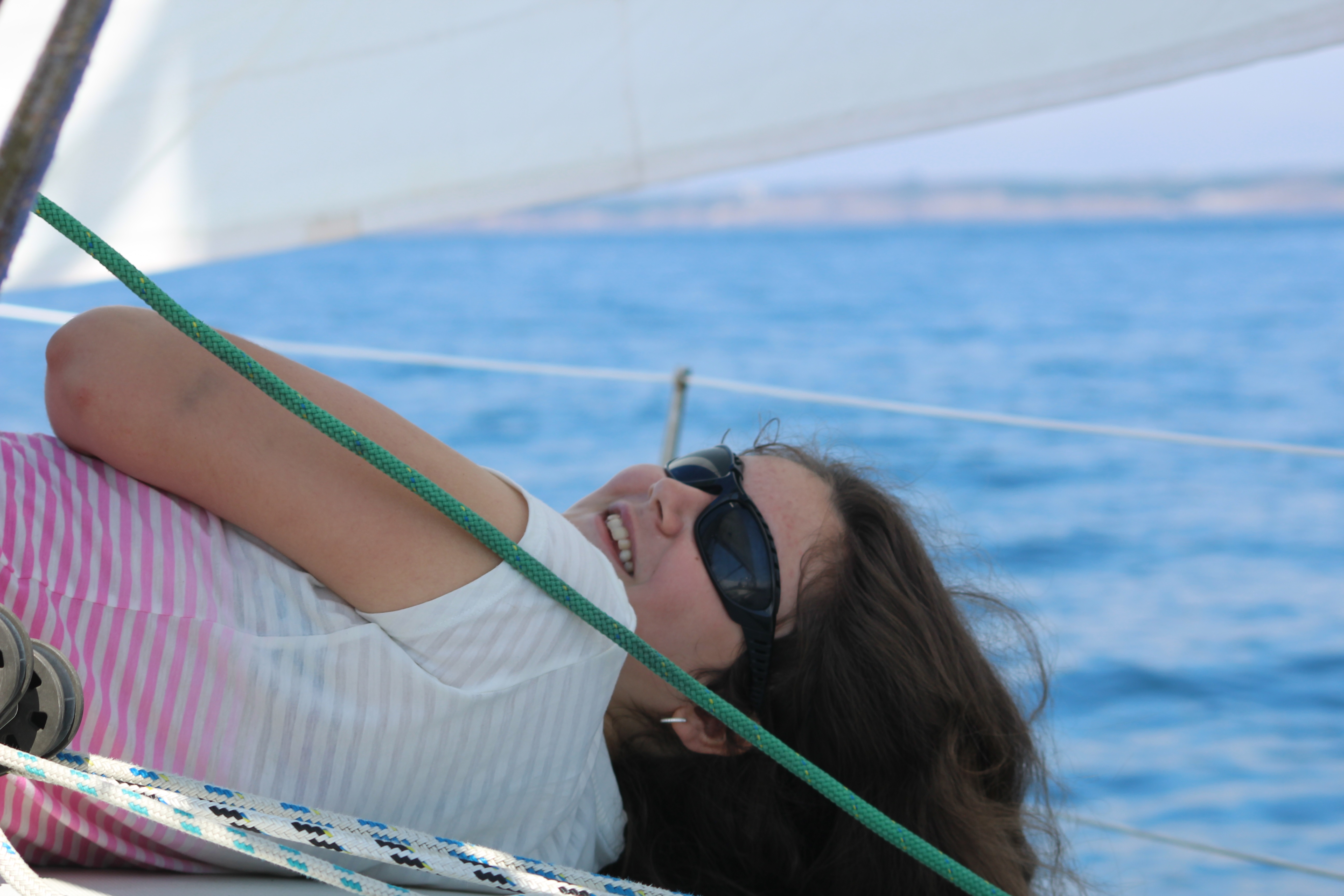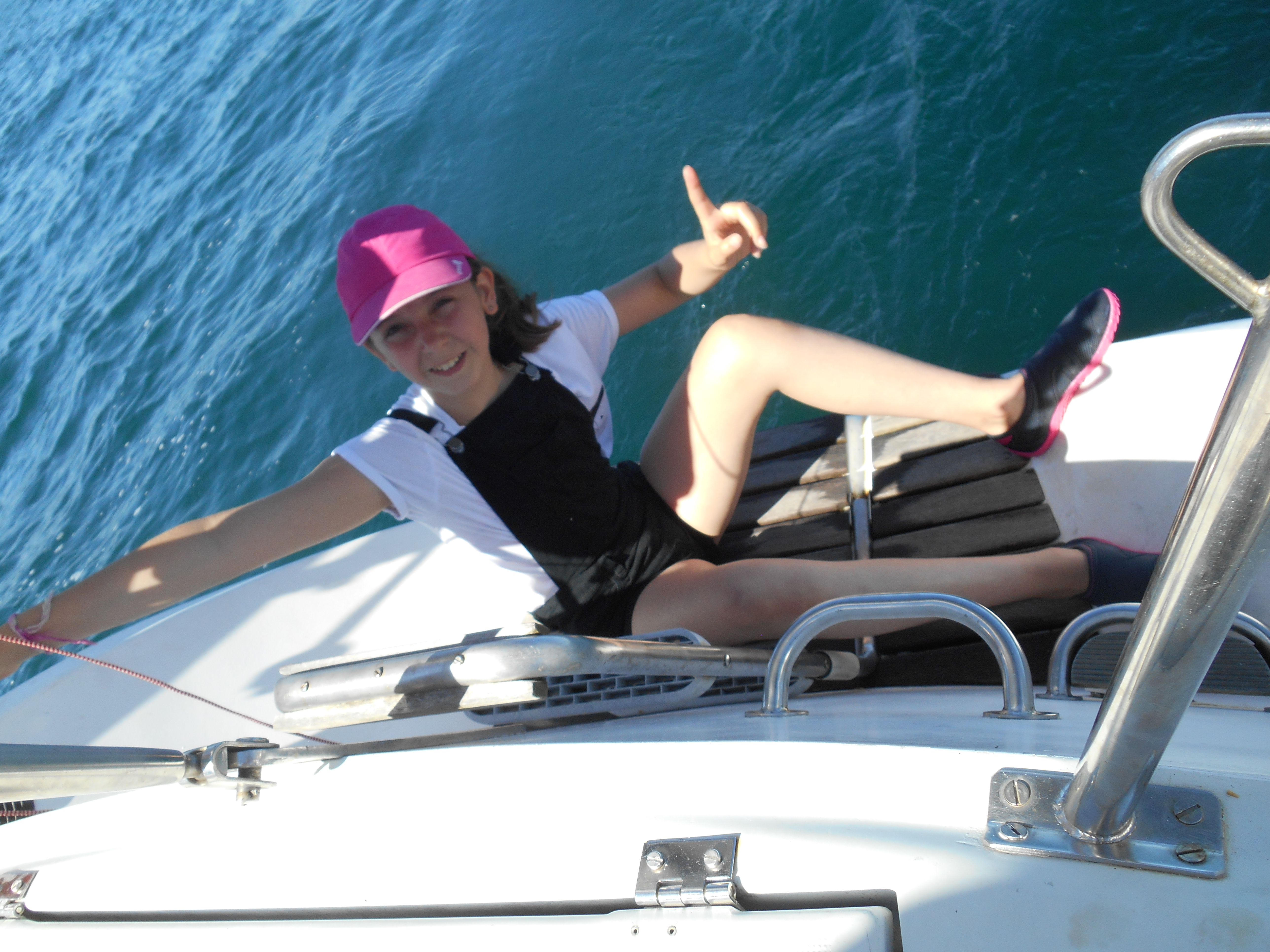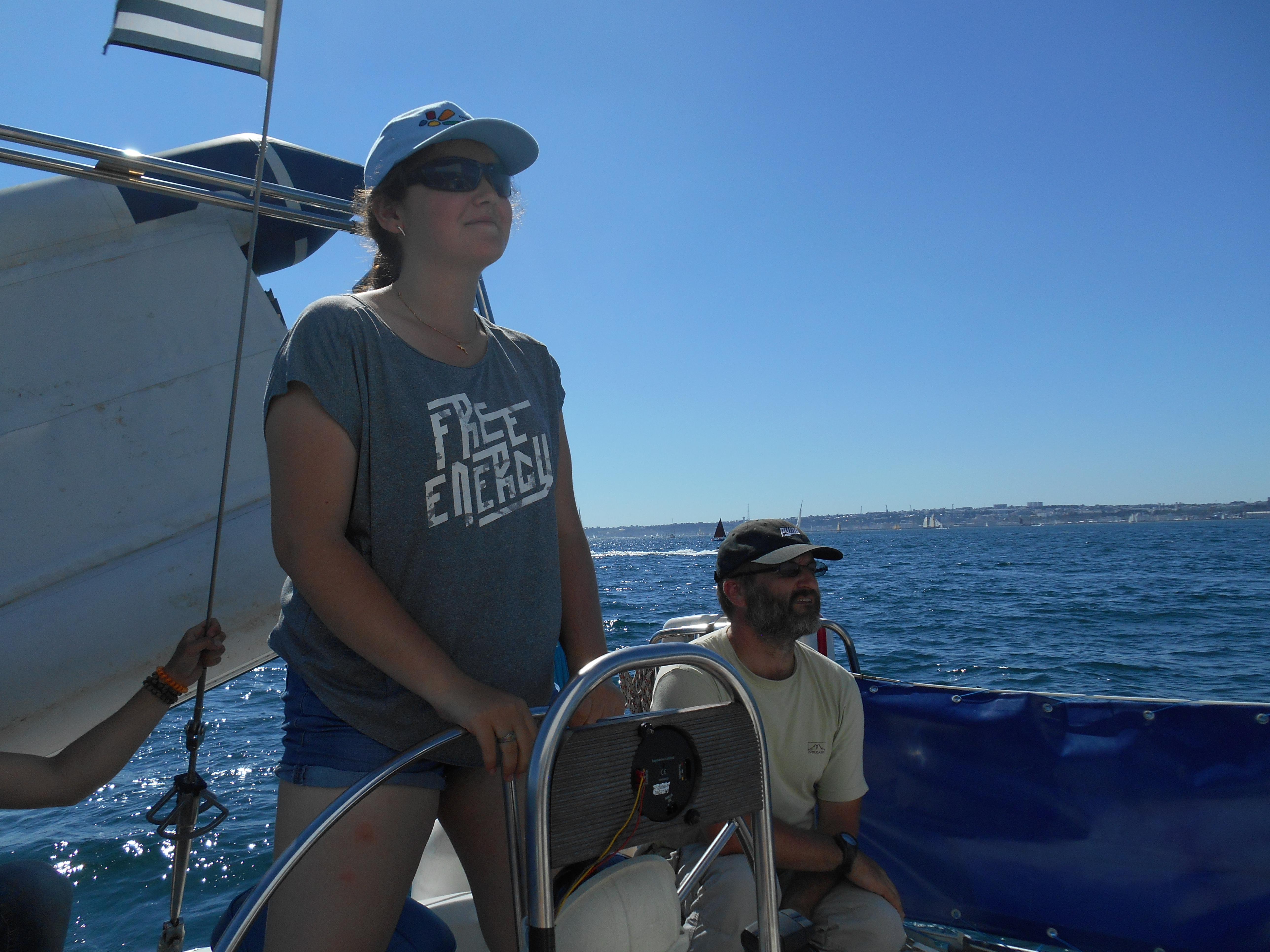 Sinon ça porte malheur. Nous avons hissé la grande voile, ce qui demande beaucoup d’efforts, mais nous y sommes arrivées. On se souviendra facilement quel ’bout’ est la drisse : c’est celle en jaune, comme la casquette d’Adèle du Tour de France !