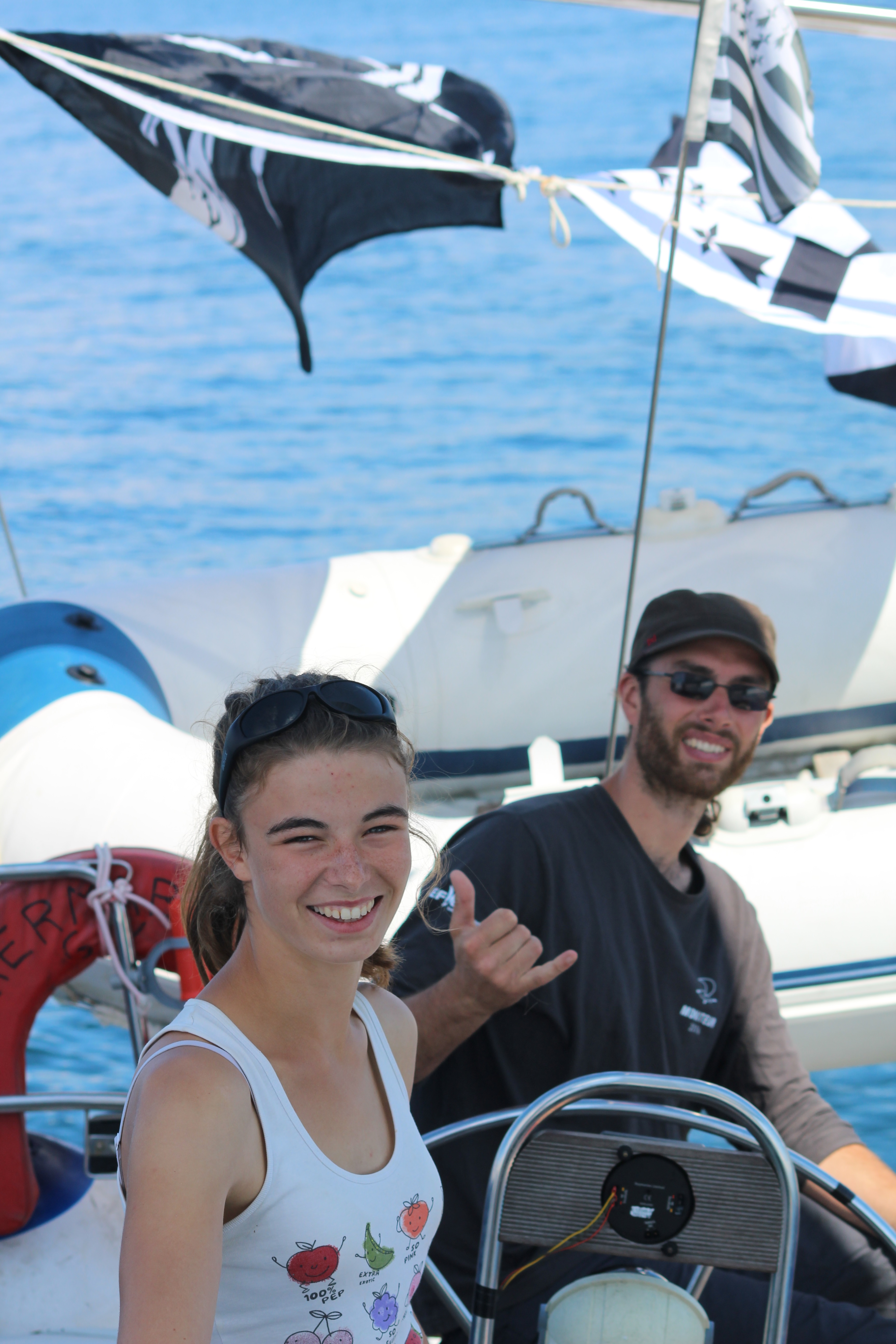 Maylie reprend son post préféré, la barre, tandis qu’Adèle règle au mieux les voiles. Puis on inverse les rôles. Après quelques virements, le vent nous abandonne et on rejoint l’équipe des drones au moteur en se préparant à l’abordage : turbans sur le visage, un drapeau de pirate au nez du bateau, les ´Colhiboux’ s’approchent de Fleur d’eau qui est à l’ancre dans une baie !