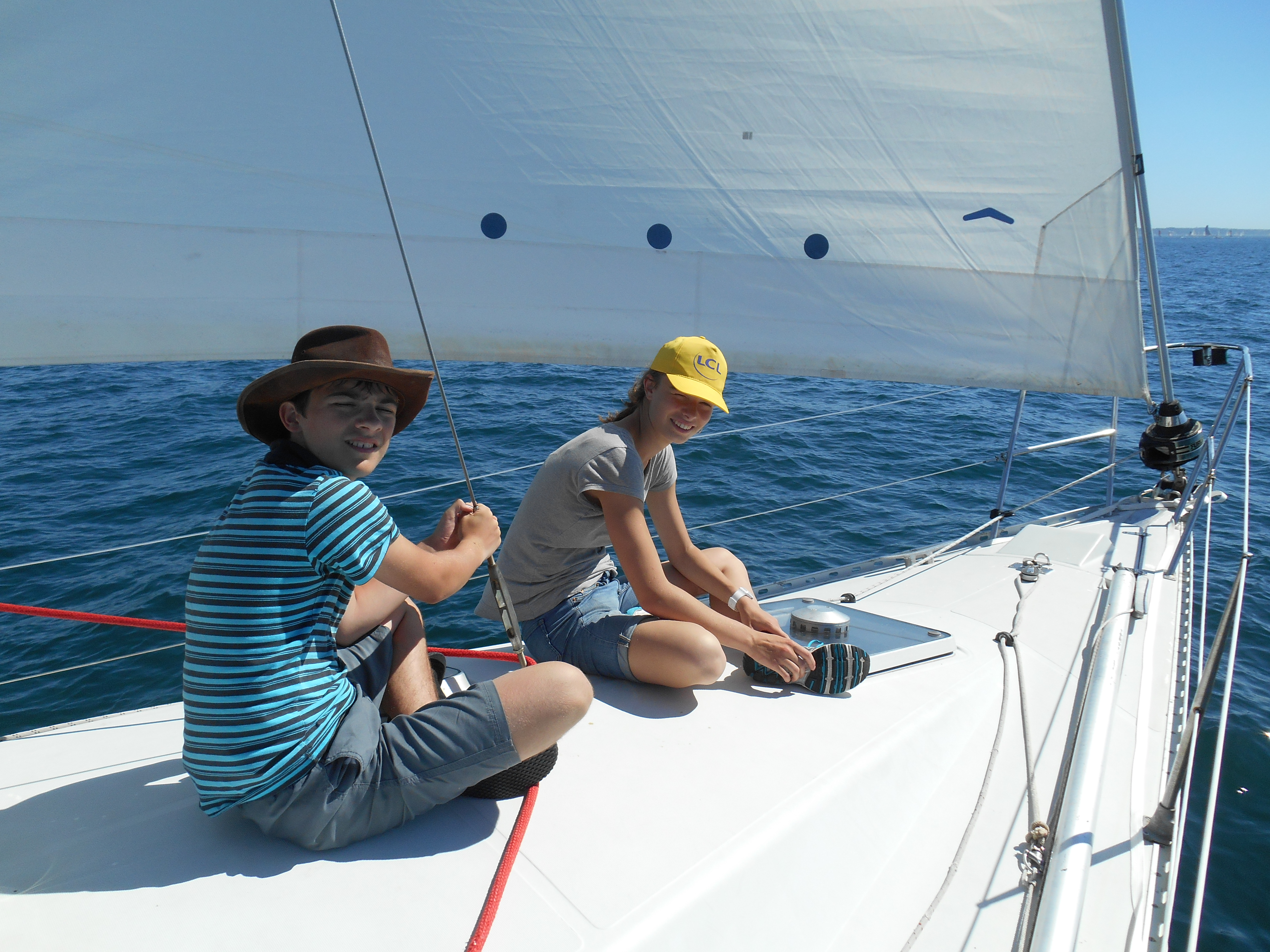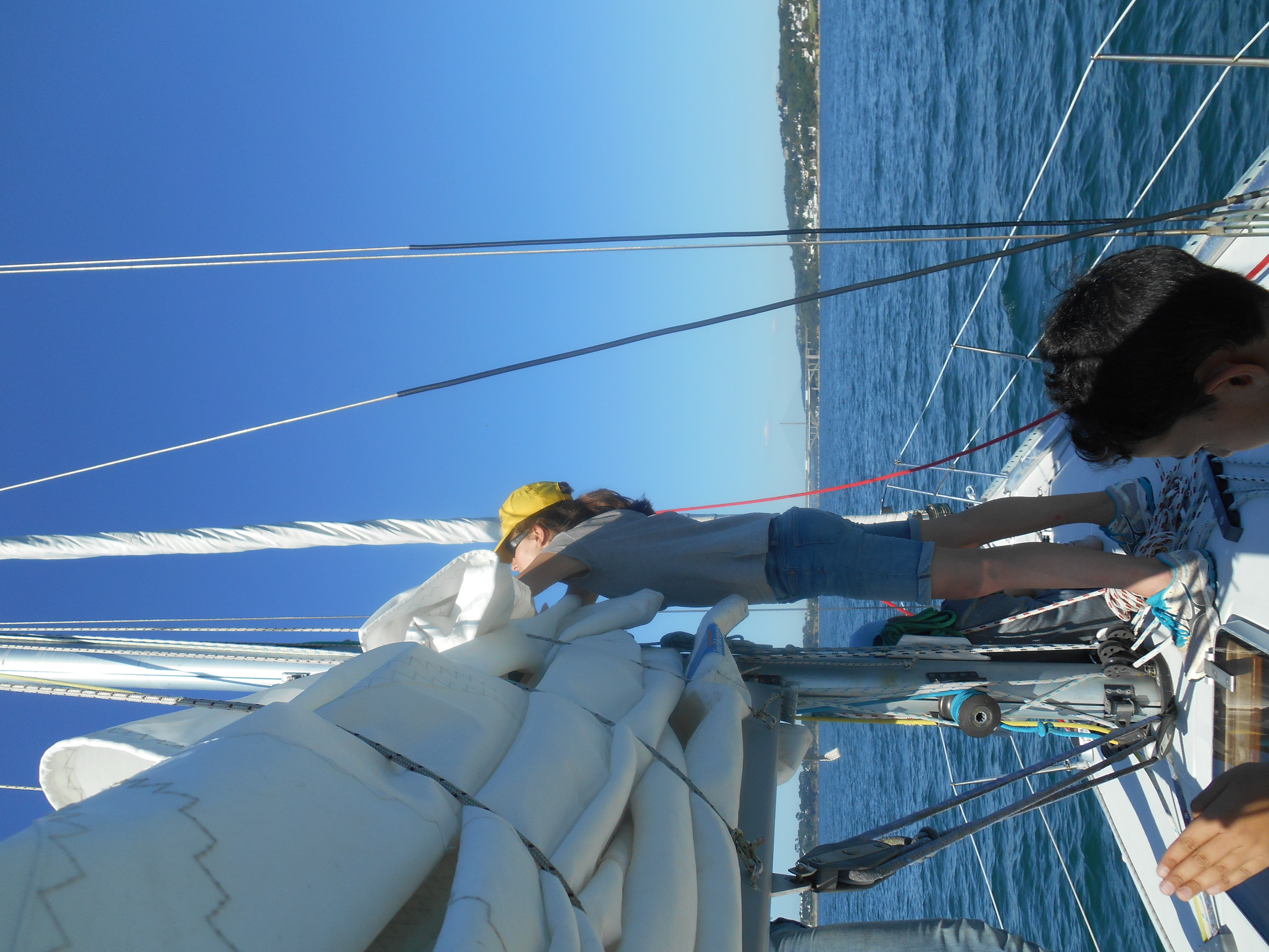 Avant de partir, on découvre avec Héléna les bouts qui nous serviront à hisser les voiles, puis on apprend toute une panoplie de noeuds qui nous serviront pendant tout le séjour : le noeud de chaise, le tour mort et deux demi-clés, le noeud de taquet et enfin celui de cabestan.