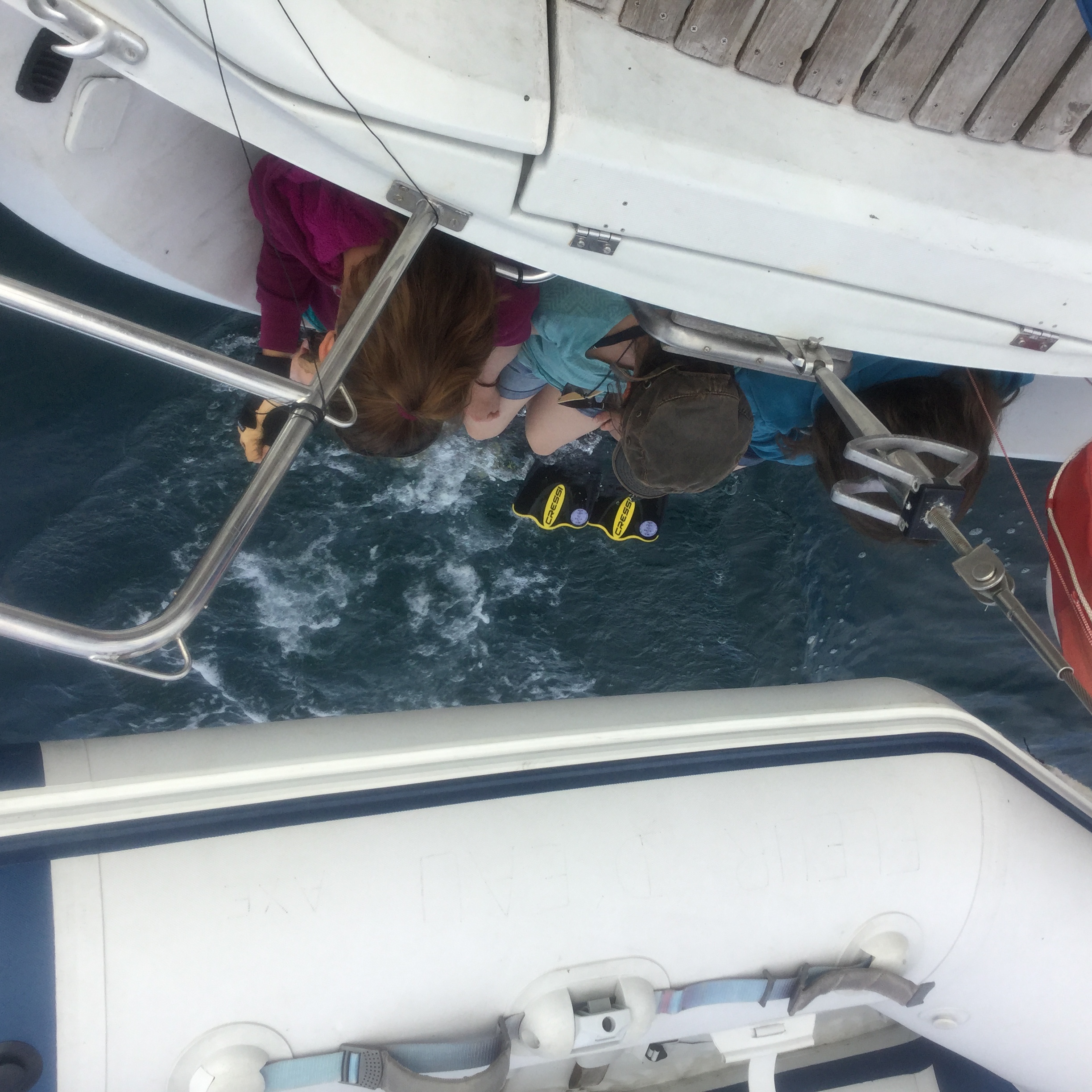 Quand on arrive, on le découvre en train de jouer autour d’un autre bateau. Il arrive rapidement vers nous dès qu’on lance l’ancre... pour jouer avec notre ancre et se gratter le dos dessus !