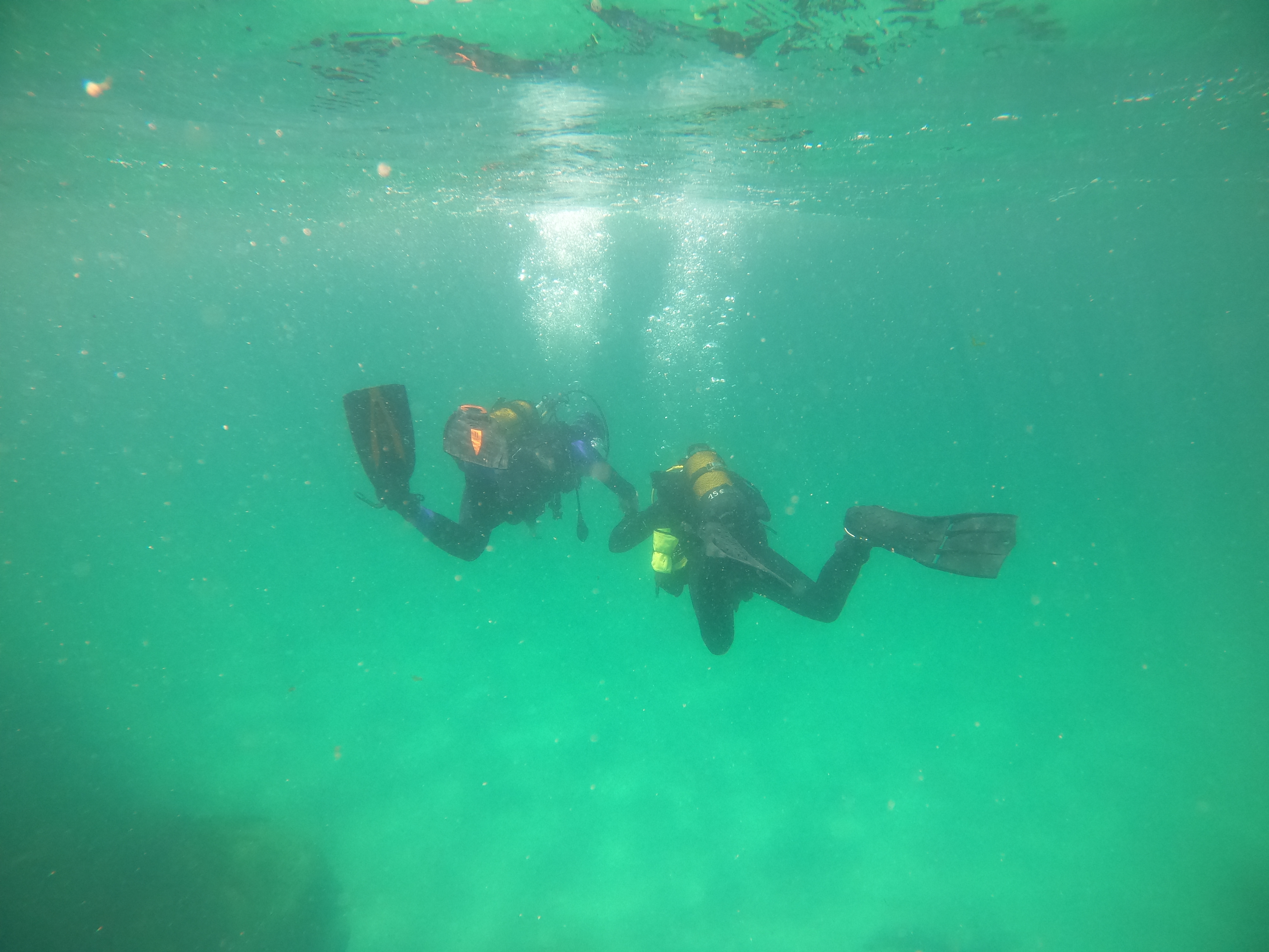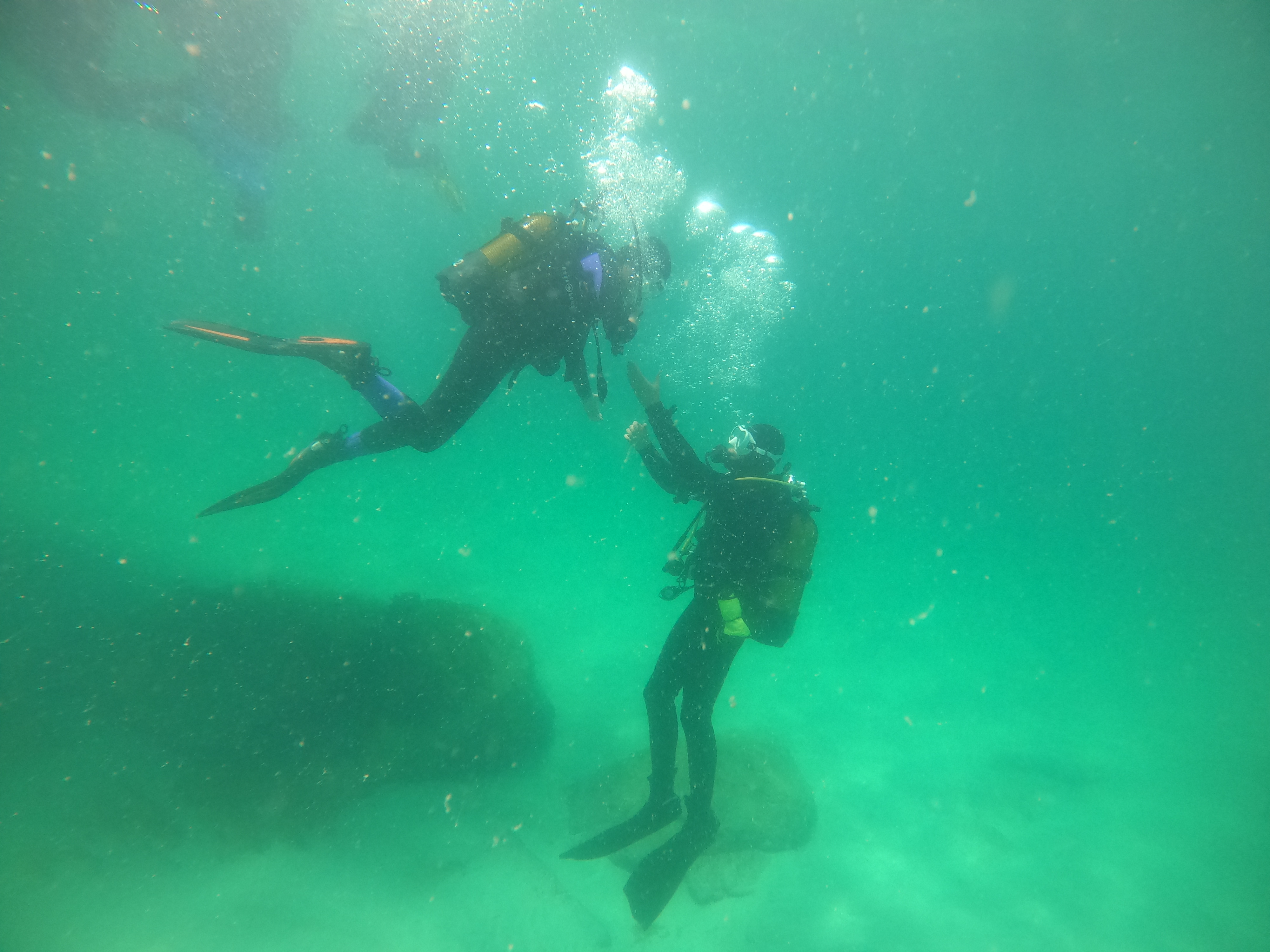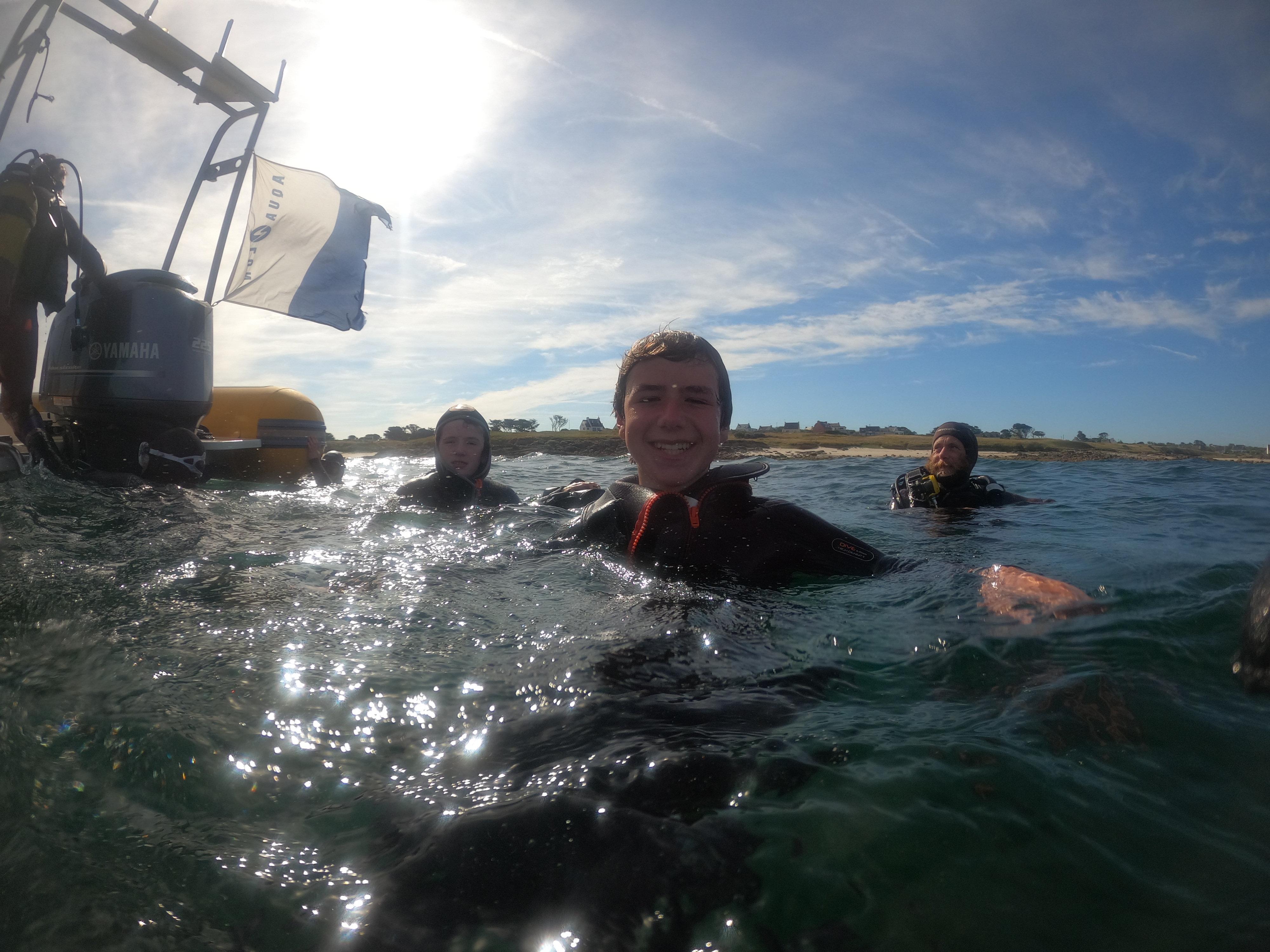 Après une douche bien méritée et un repas léger c’est repartie pour trois des participants, Milaya, Noé et Victoria. Ils ont passés l’après-midi dans l’eau pour se familiariser avec le milieu et on donc fait leur baptême de plongée !