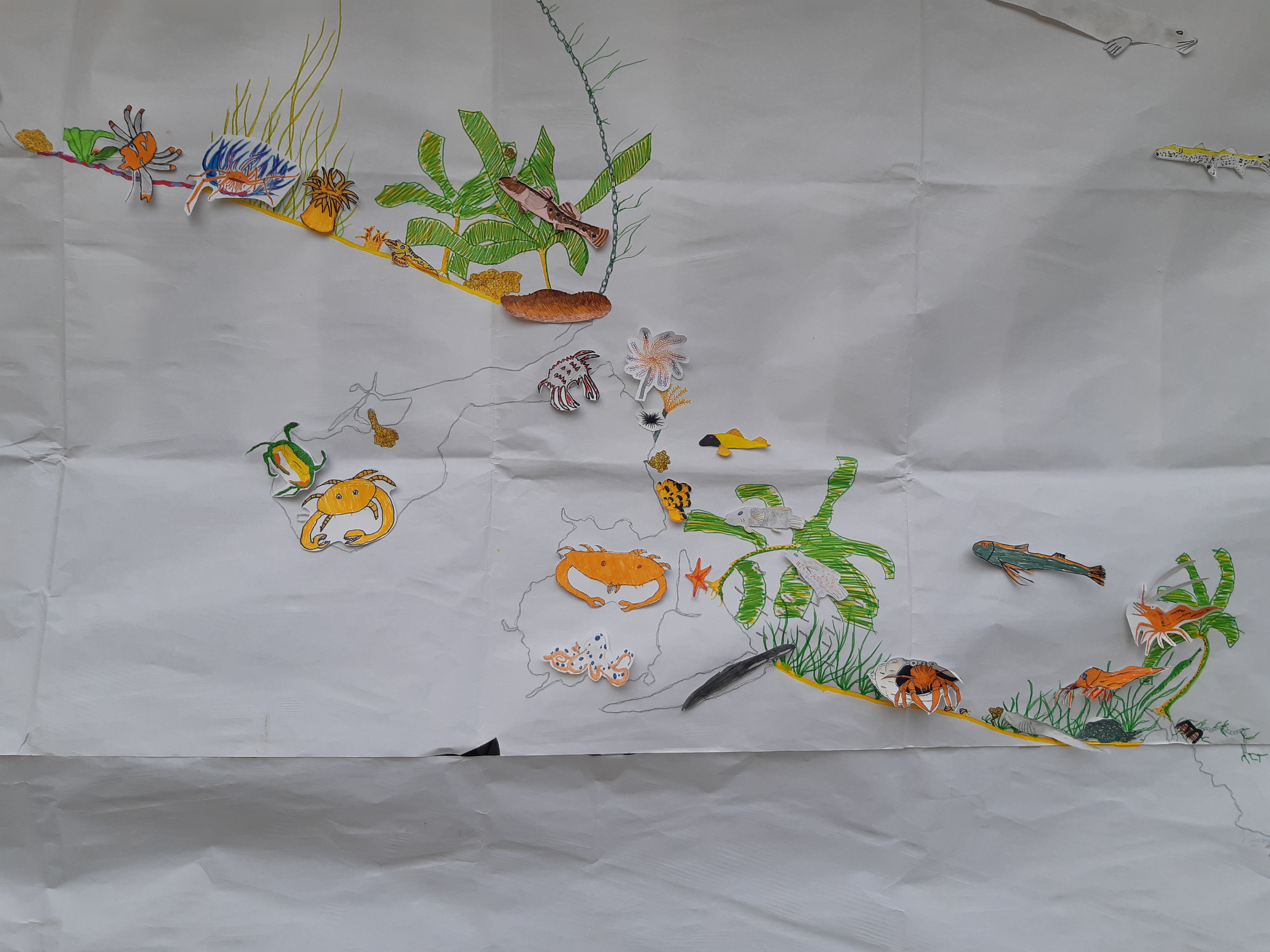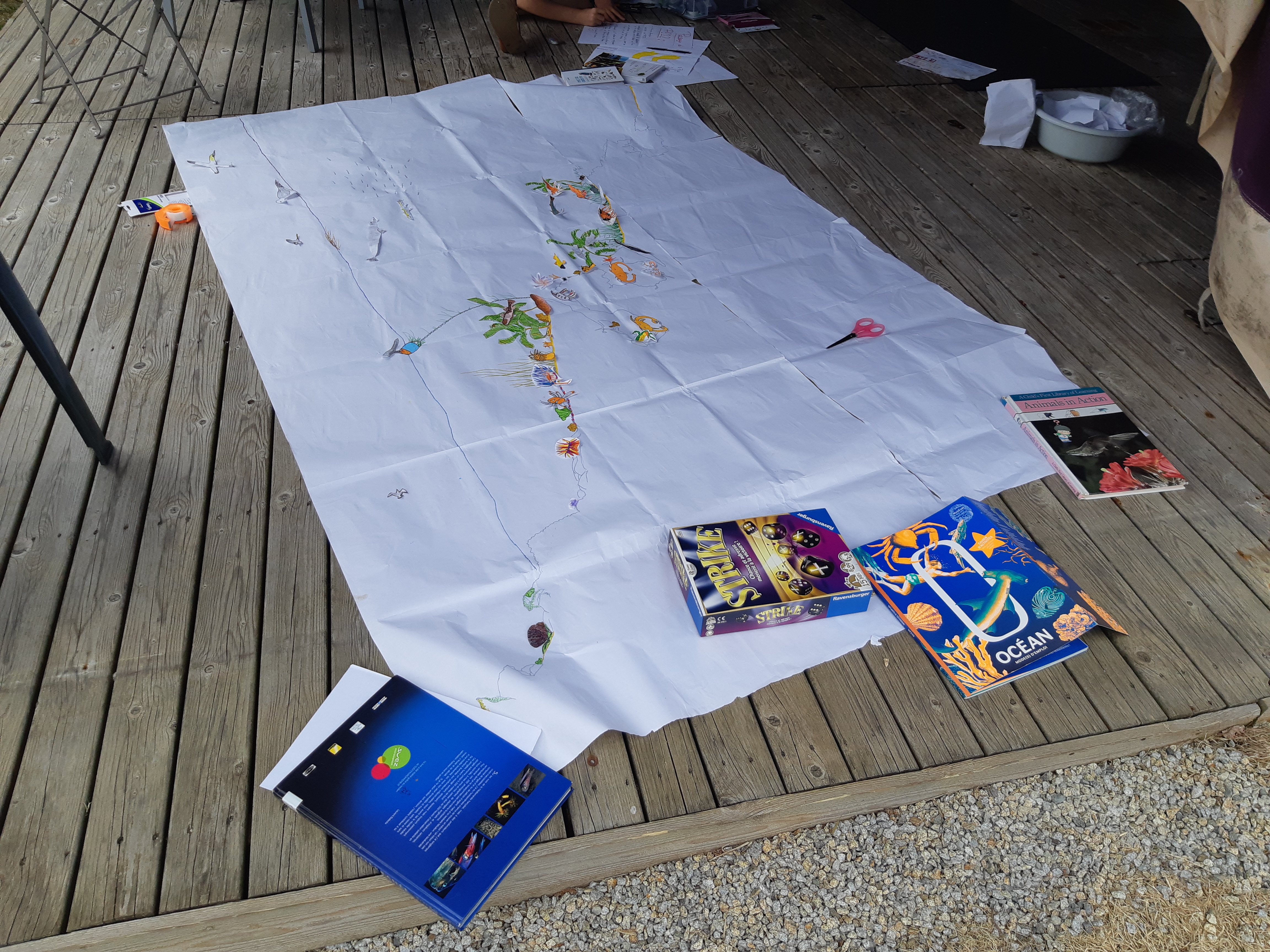 Après notre pause de midi, c’est reparti pour une troisième plongée de la semaine pour la plupart d’entre nous. Un débrief de plongée et un pod-cast marin accompagnent le repos de ceux qui sont restés sur le camp. Avec Sara nous avons continué nos activités scientifiques de la veille. Nous avons redéfini les différents habitats rencontrés lors de nos plongées. A travers une activité artistique nous avons pu nommer les différents organismes marins et leurs répartitions dans l’écosystème.